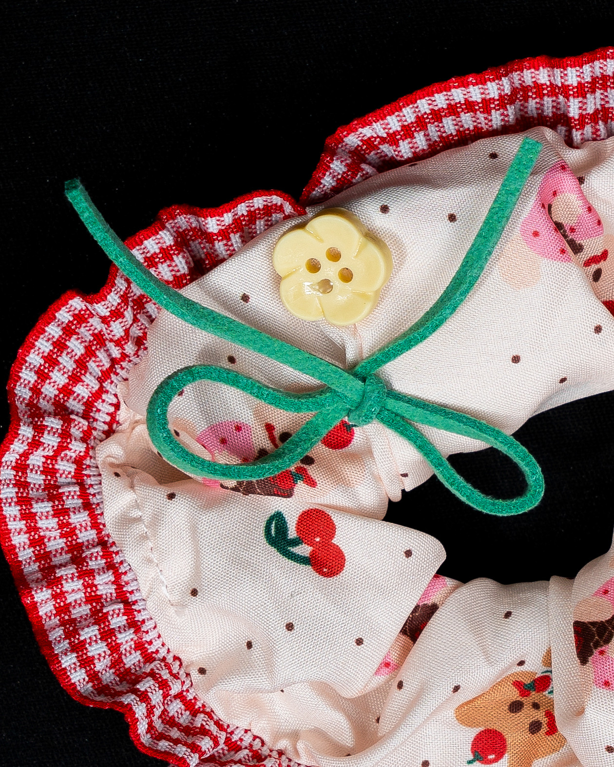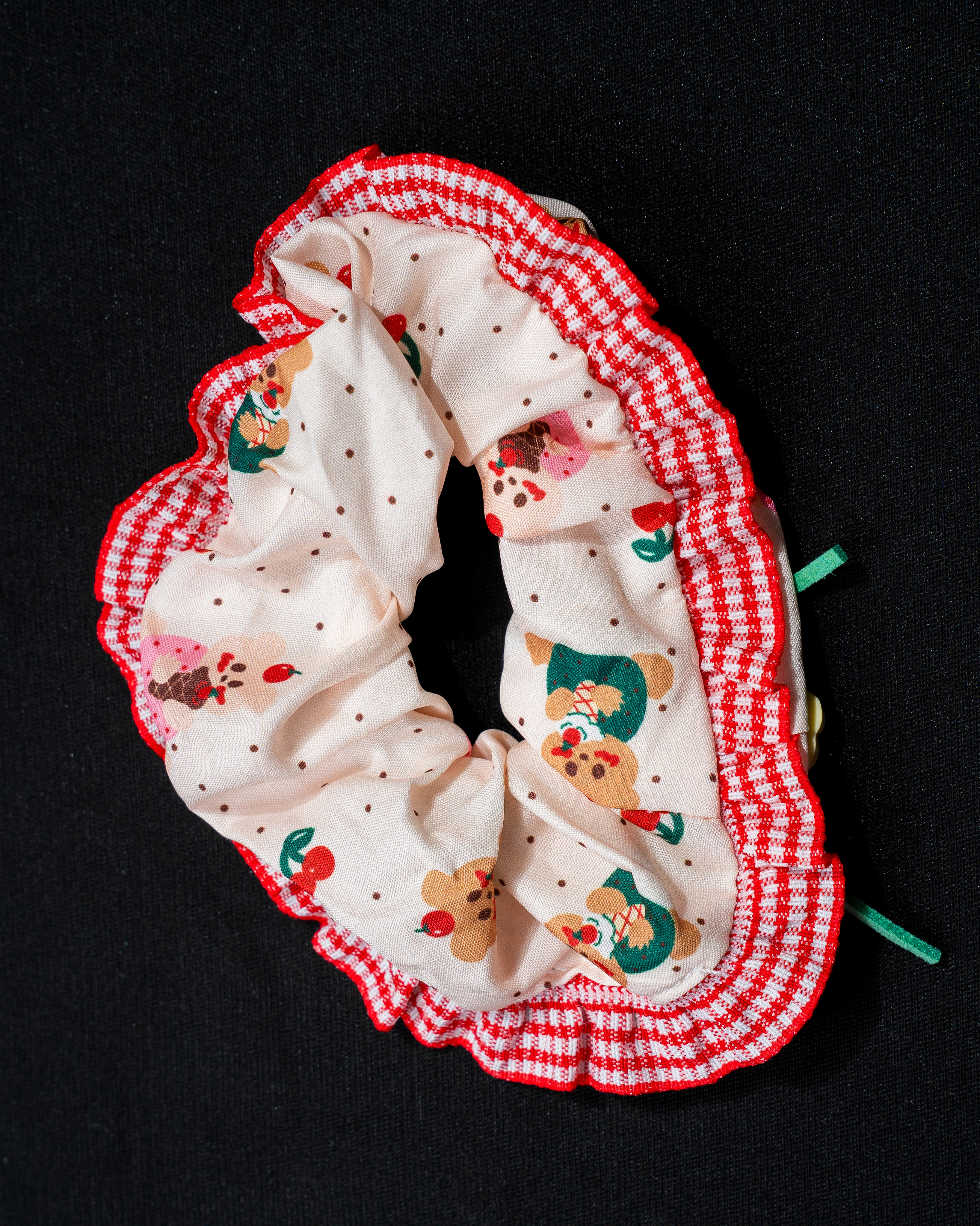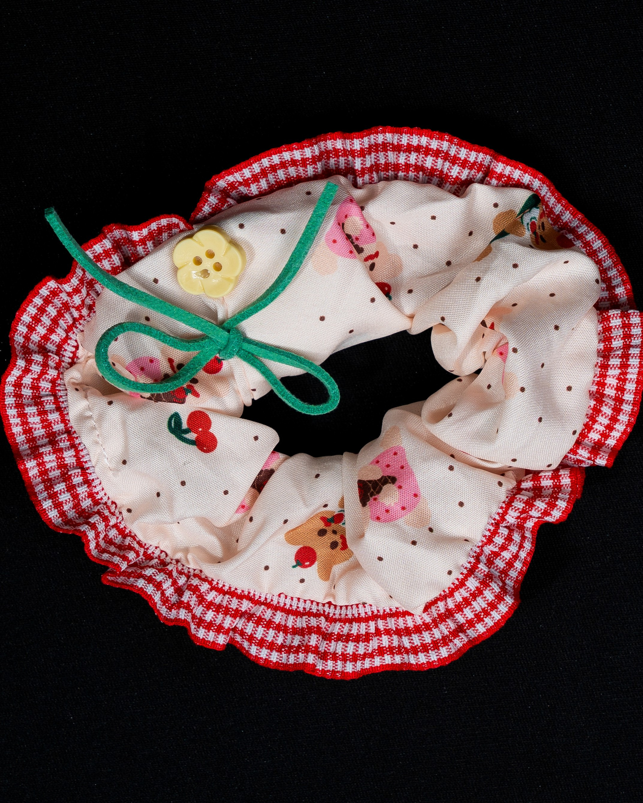 A playful scrunchie featuring a soft cream base with cute berry-inspired prints, framed by a vibrant red gingham frill. Finished with a tiny button and ribbon detail, it brings a fun, picnic-ready charm to your look.