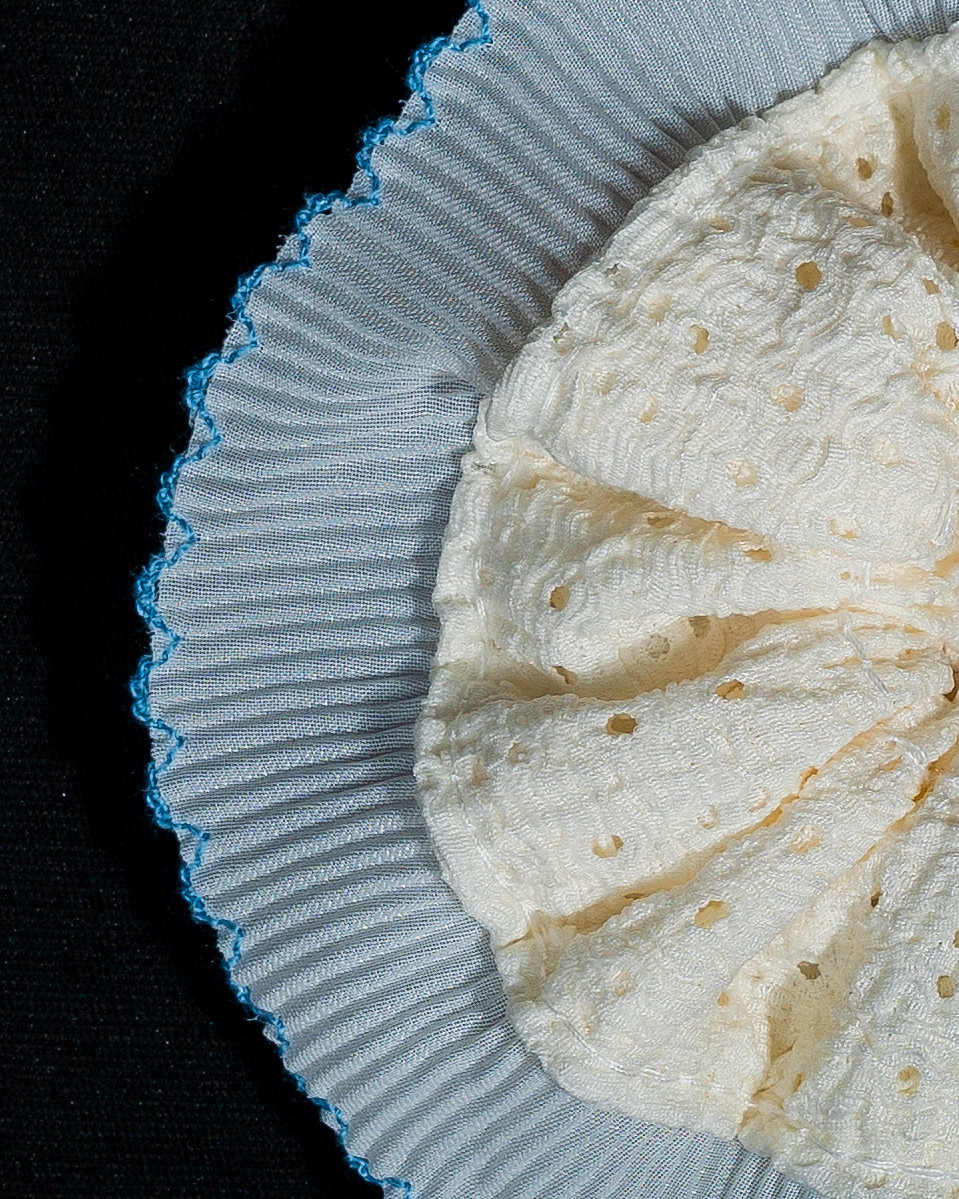 A delicate blend of creamy eyelet fabric wrapped in airy pleated frills, finished with a cool blue edge for a frosted touch. The contrast feels soft yet refreshing—like a winter morning with a hint of sky blue—perfect for adding subtle charm to your look.