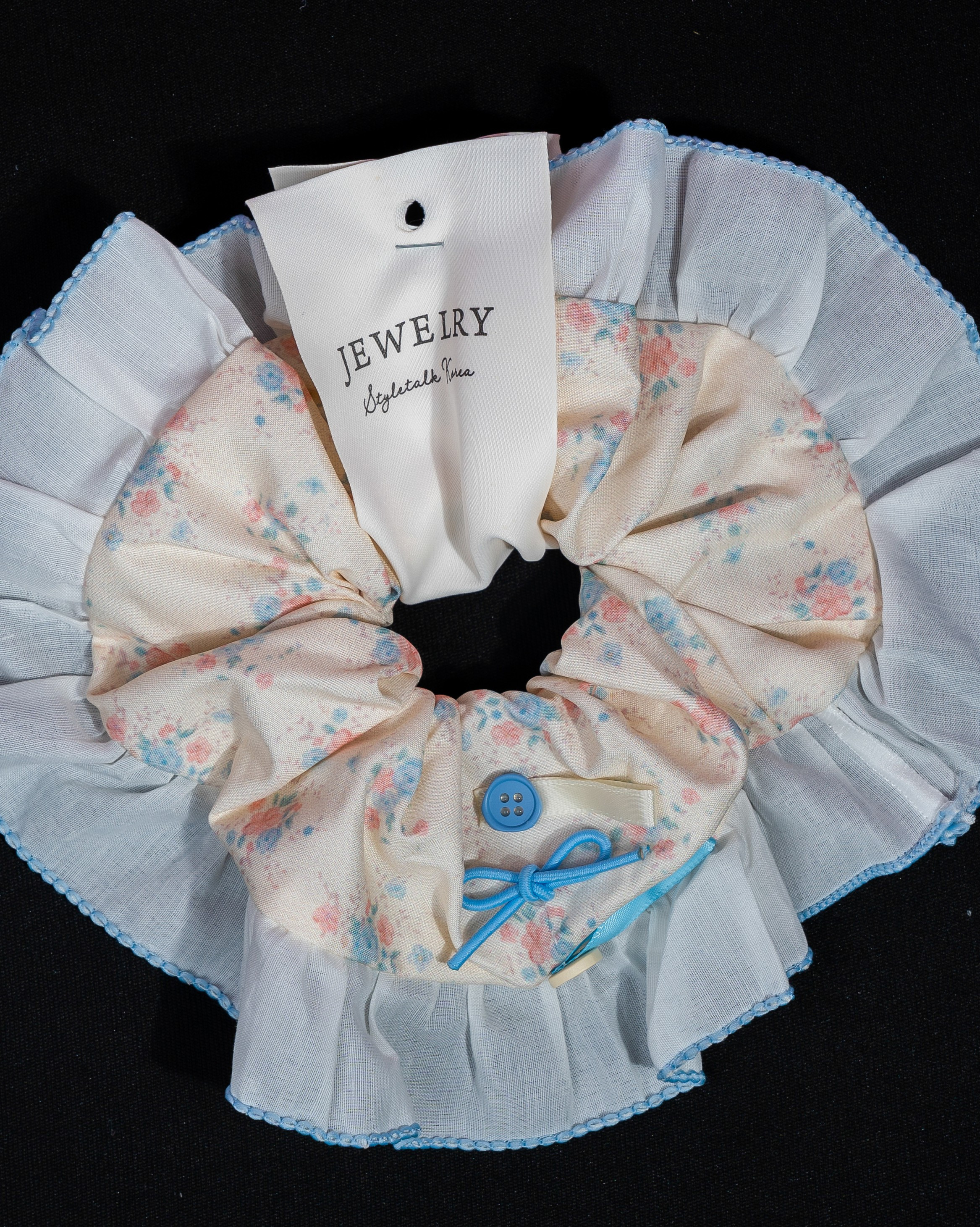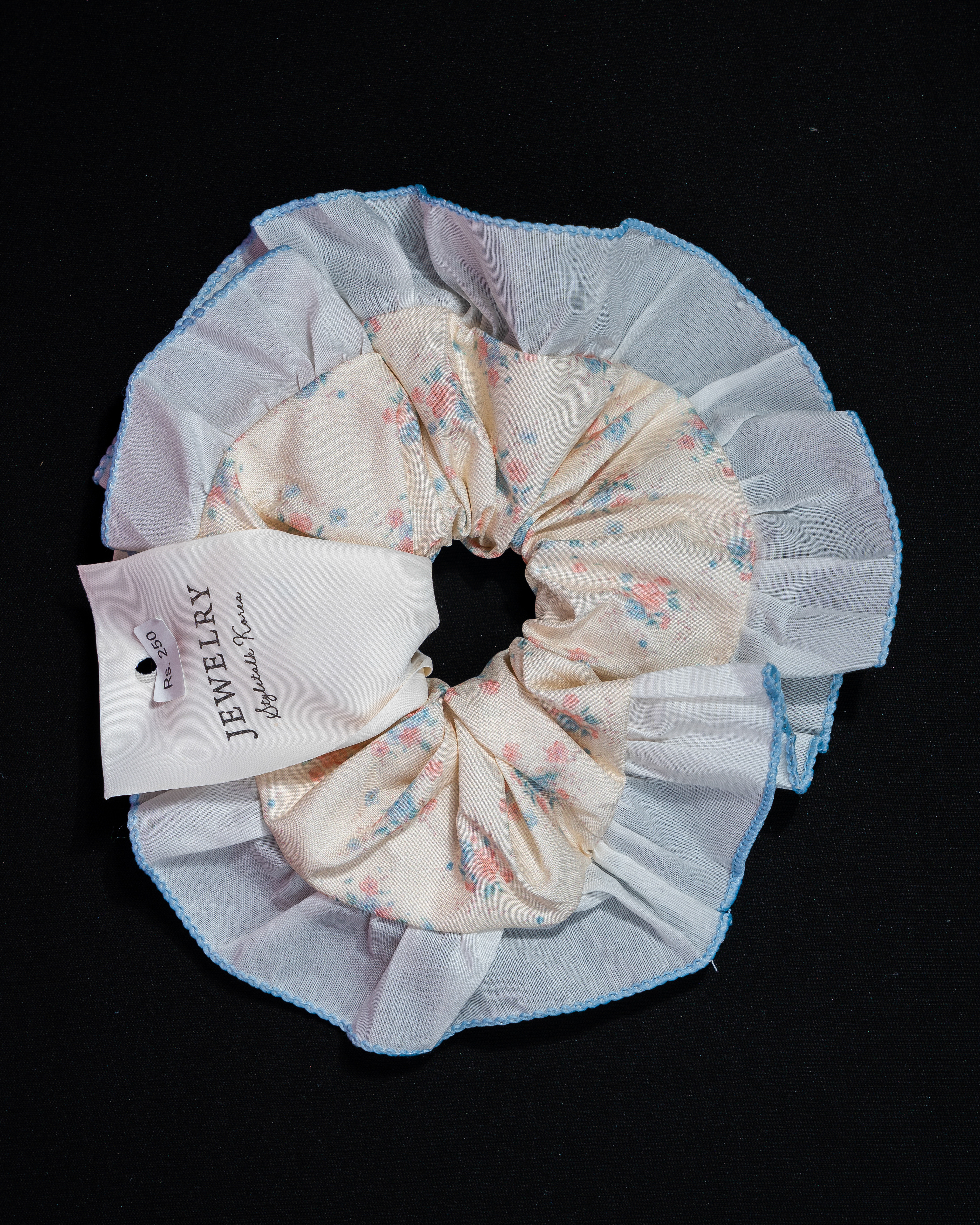 A soft floral scrunchie in gentle pastel tones, framed with airy lace and delicate blue edging. Finished with a tiny button and ribbon detail, it brings a sweet, garden-inspired charm with a touch of vintage elegance.