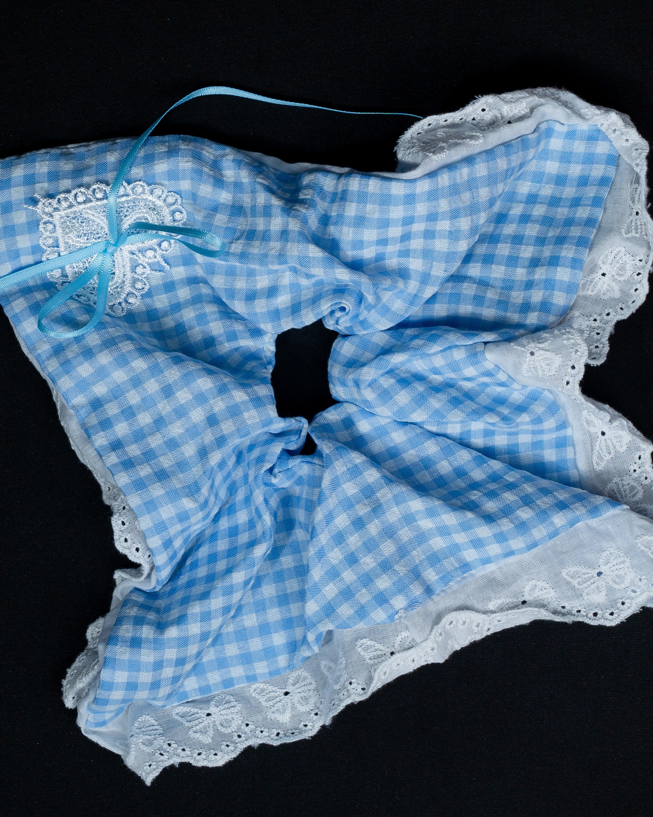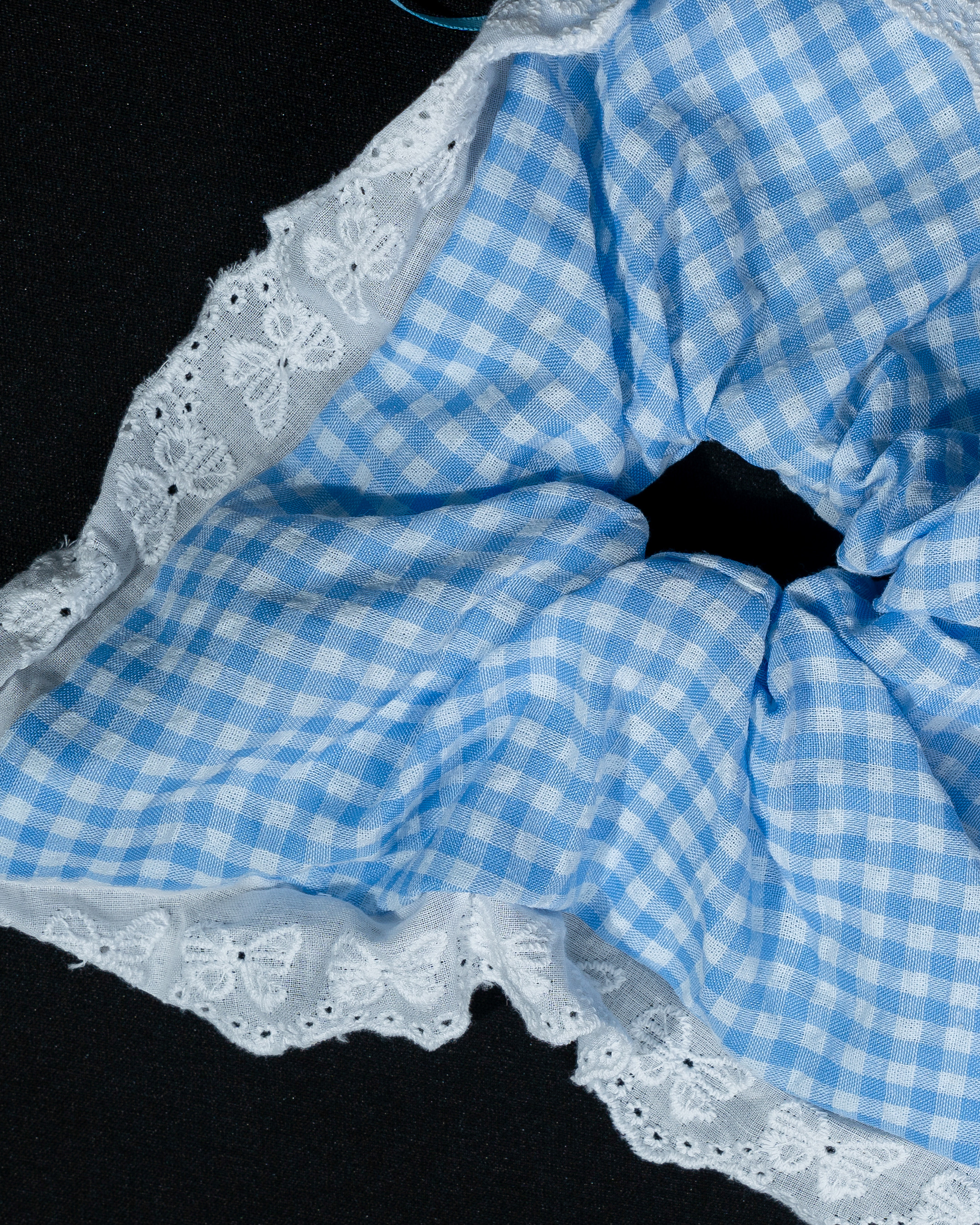 A charming blue gingham scrunchie with delicate lace edges and a tiny ribbon detail, inspired by soft picnic aesthetics. Its fresh, vintage-inspired design brings a sweet and airy feel to your everyday hairstyles.