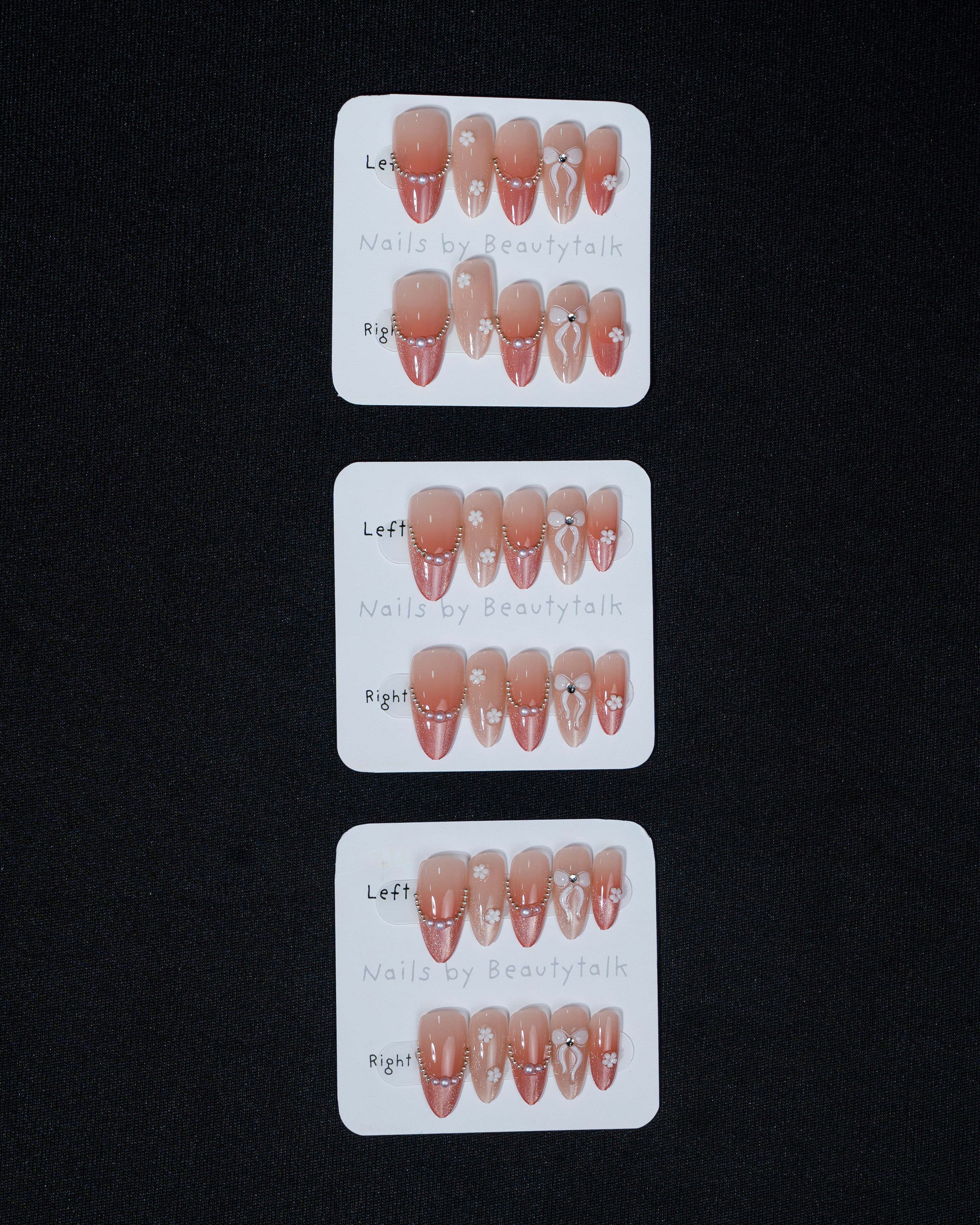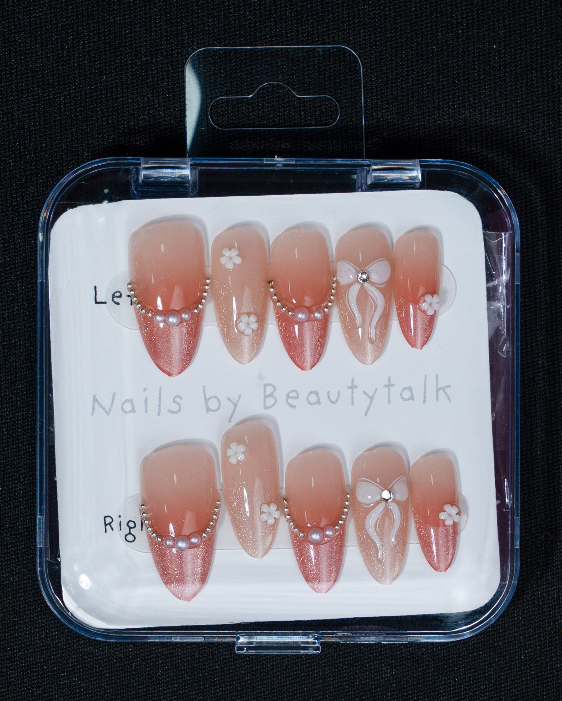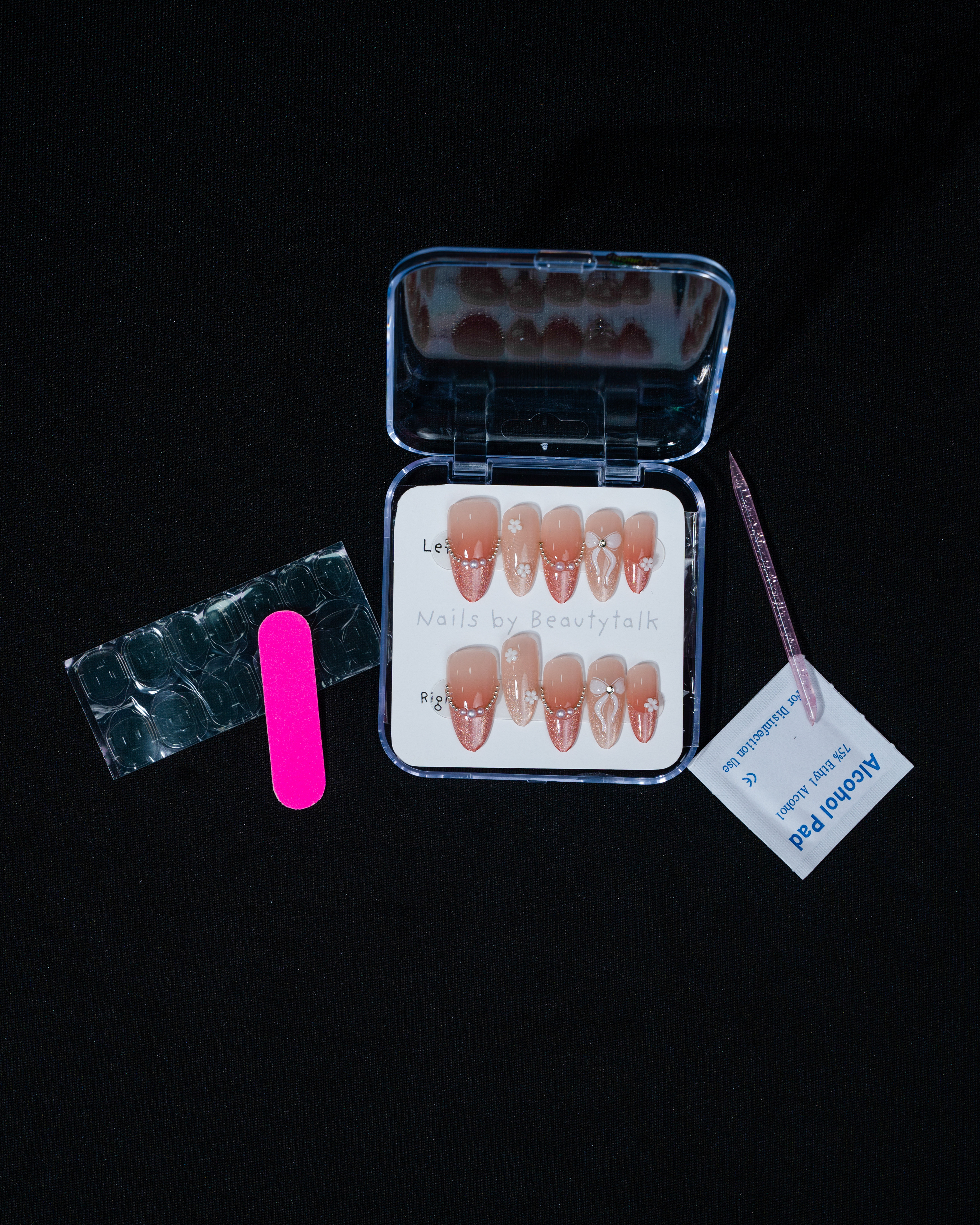 A soft blush pink press-on nail set with a glossy finish. Designed with delicate butterfly accents, floral details, and a hint of shimmer for a dreamy, feminine look.
