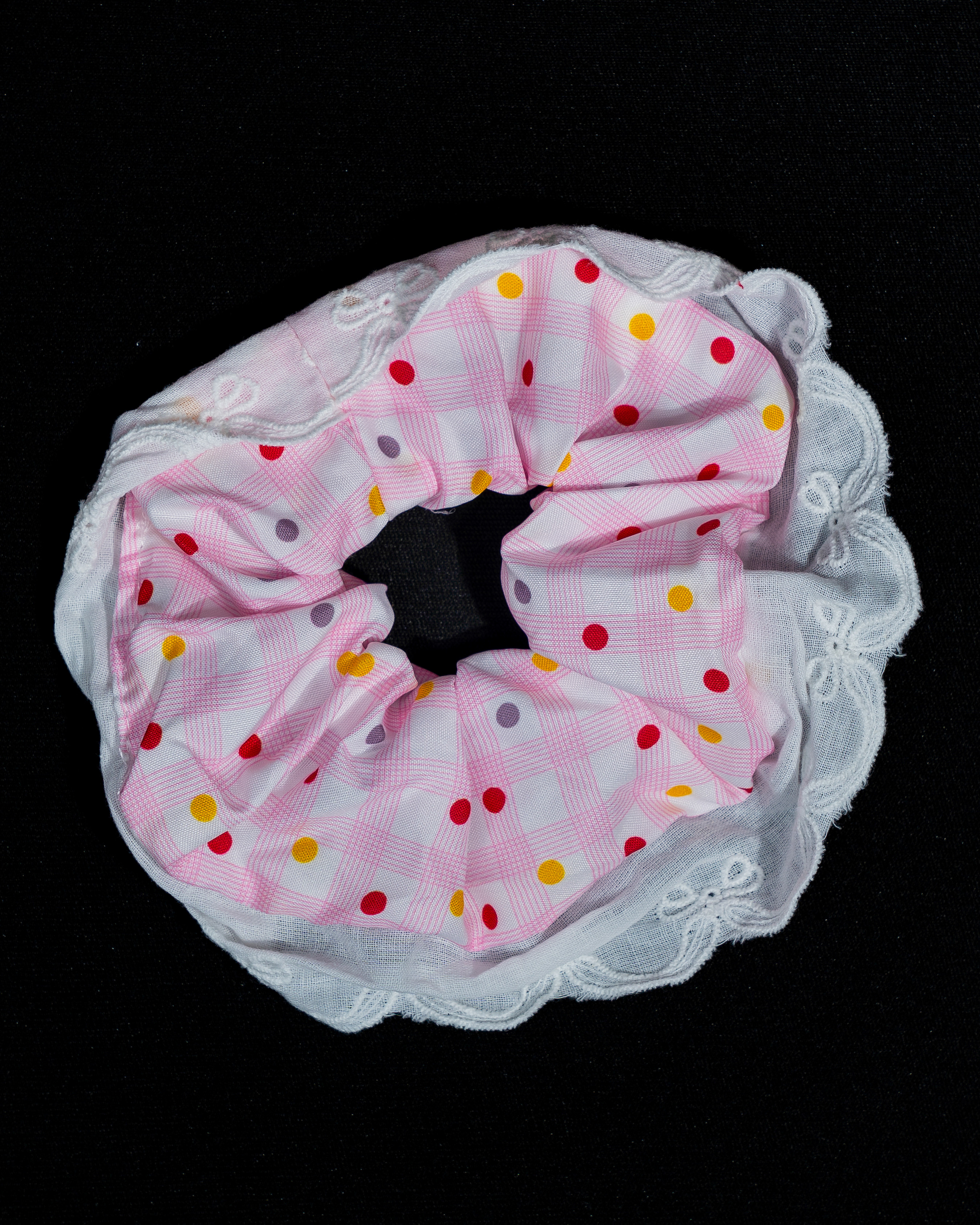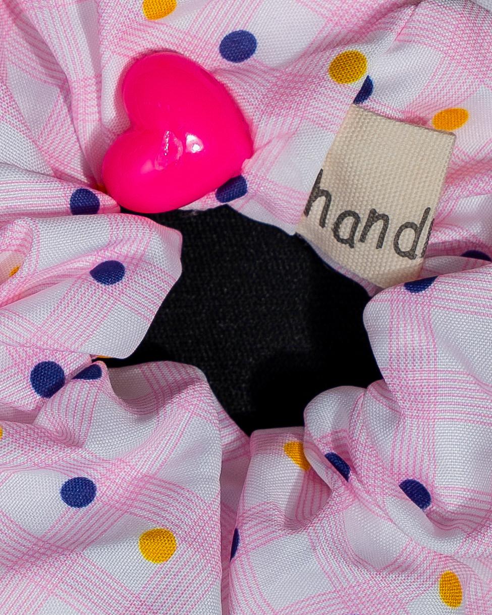 A playful pastel scrunchie featuring soft pink tones with colorful confetti dots and a cute heart accent. Finished with delicate lace edges, it brings a fun, sweet, and girly vibe with a touch of charm.