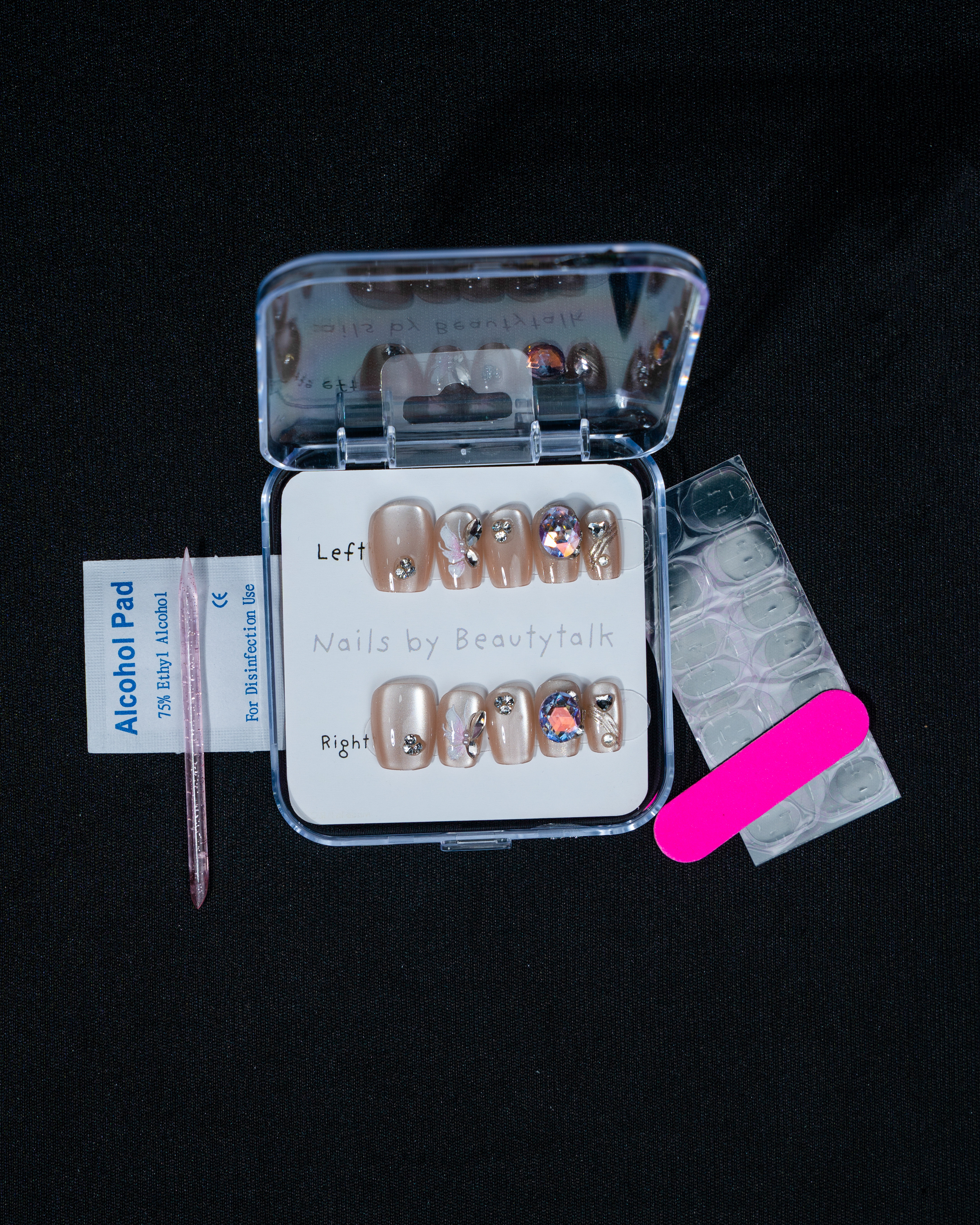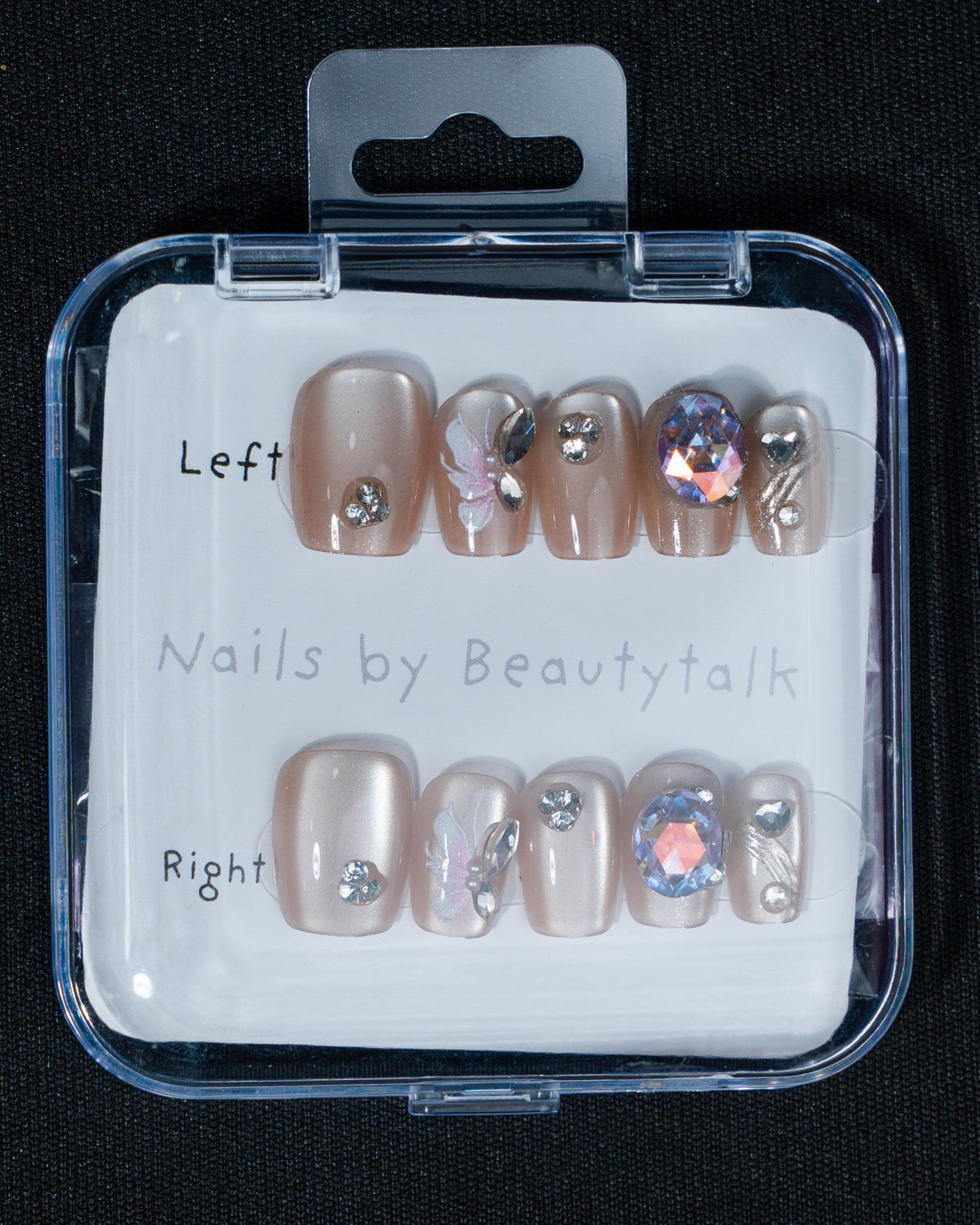 A nude-toned press-on nail set with a champagne sheen, featuring rhinestones, crystal embellishments, and subtle metallic detailing for a clean, polished look.