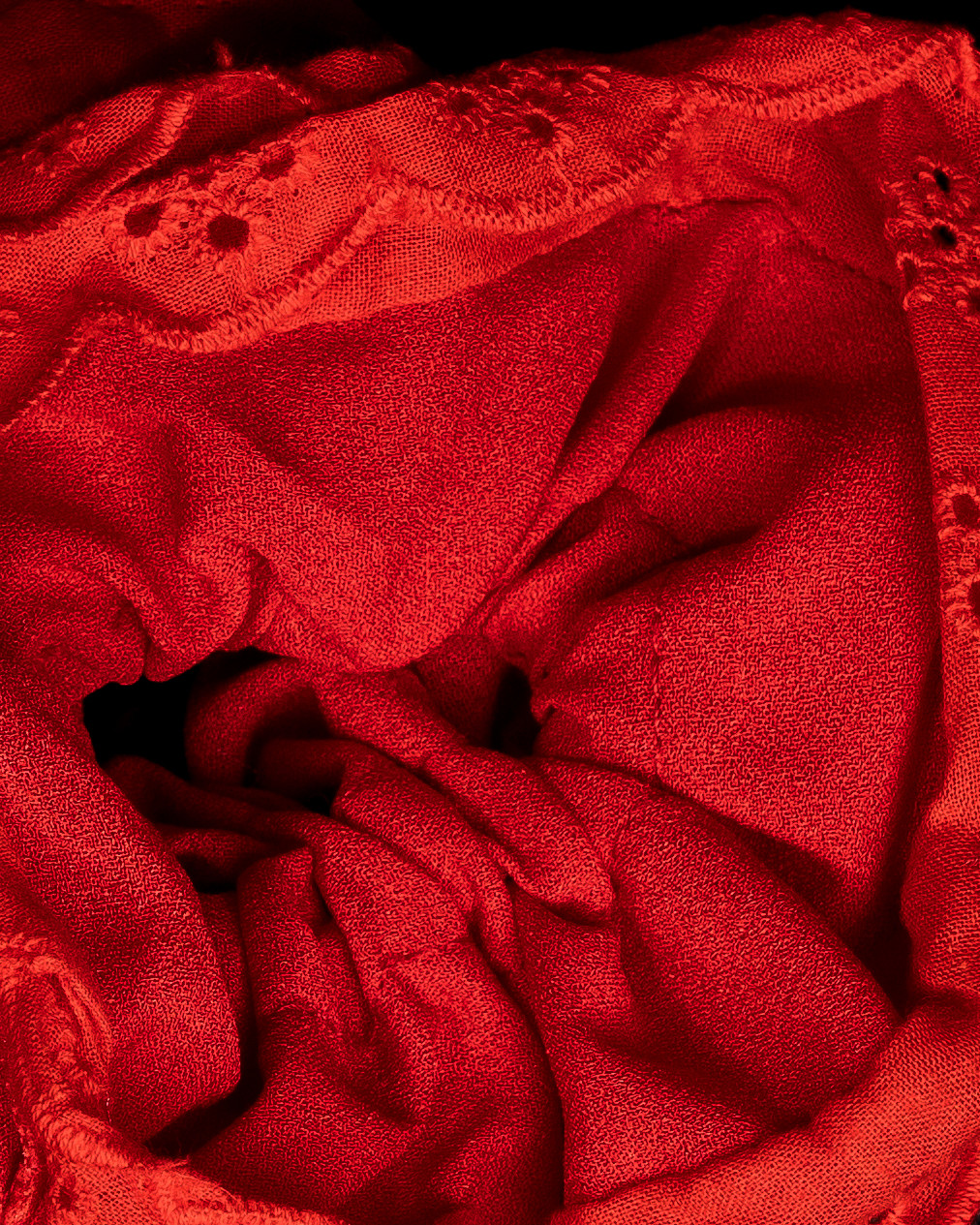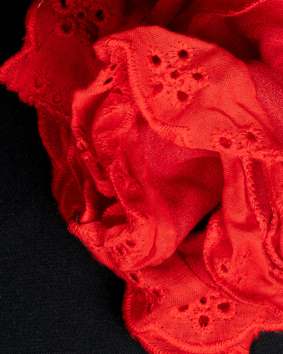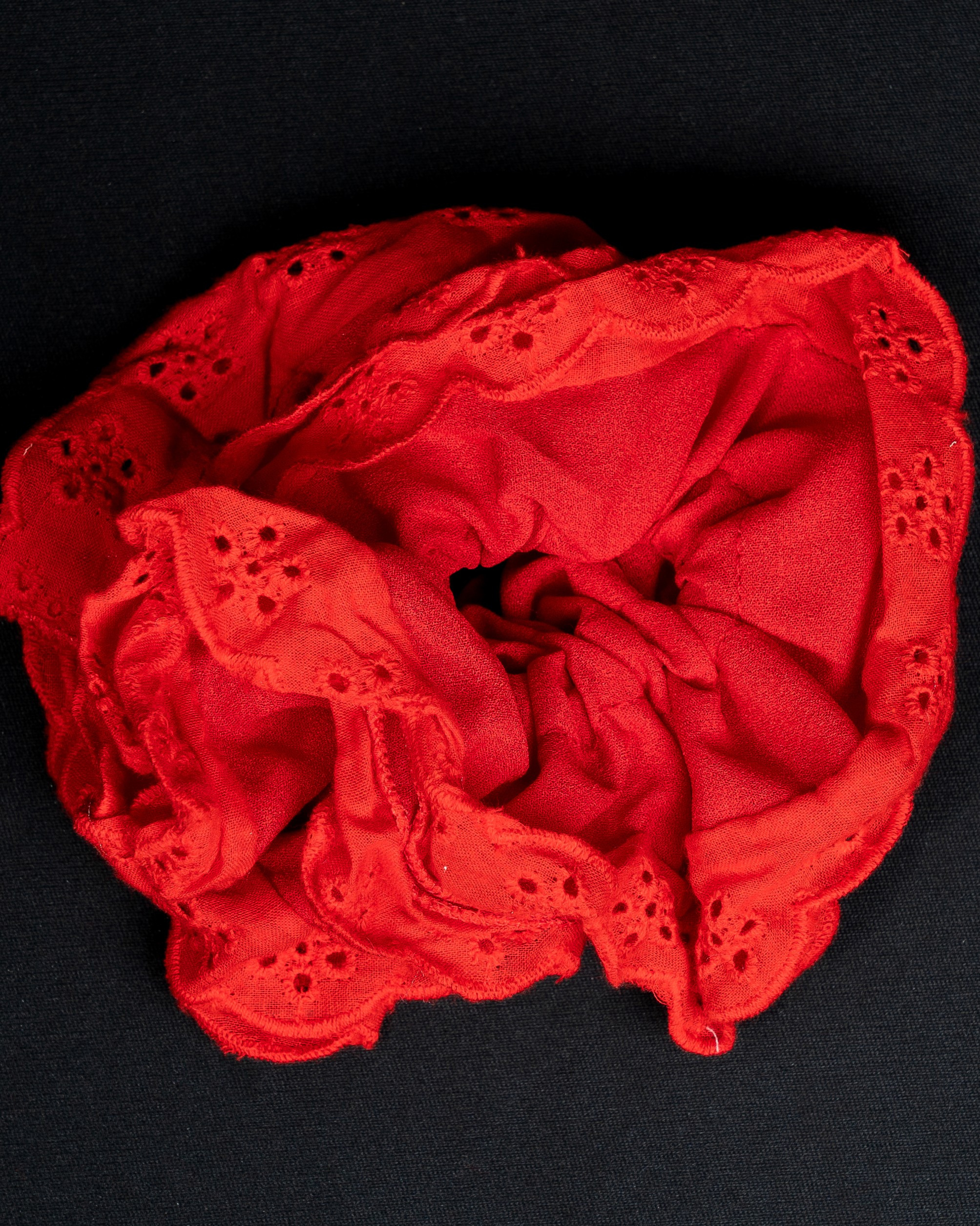 A rich cherry red scrunchie with delicate lace detailing and soft, flowing layers. Its romantic design blends bold color with feminine texture, creating a graceful yet eye-catching look.