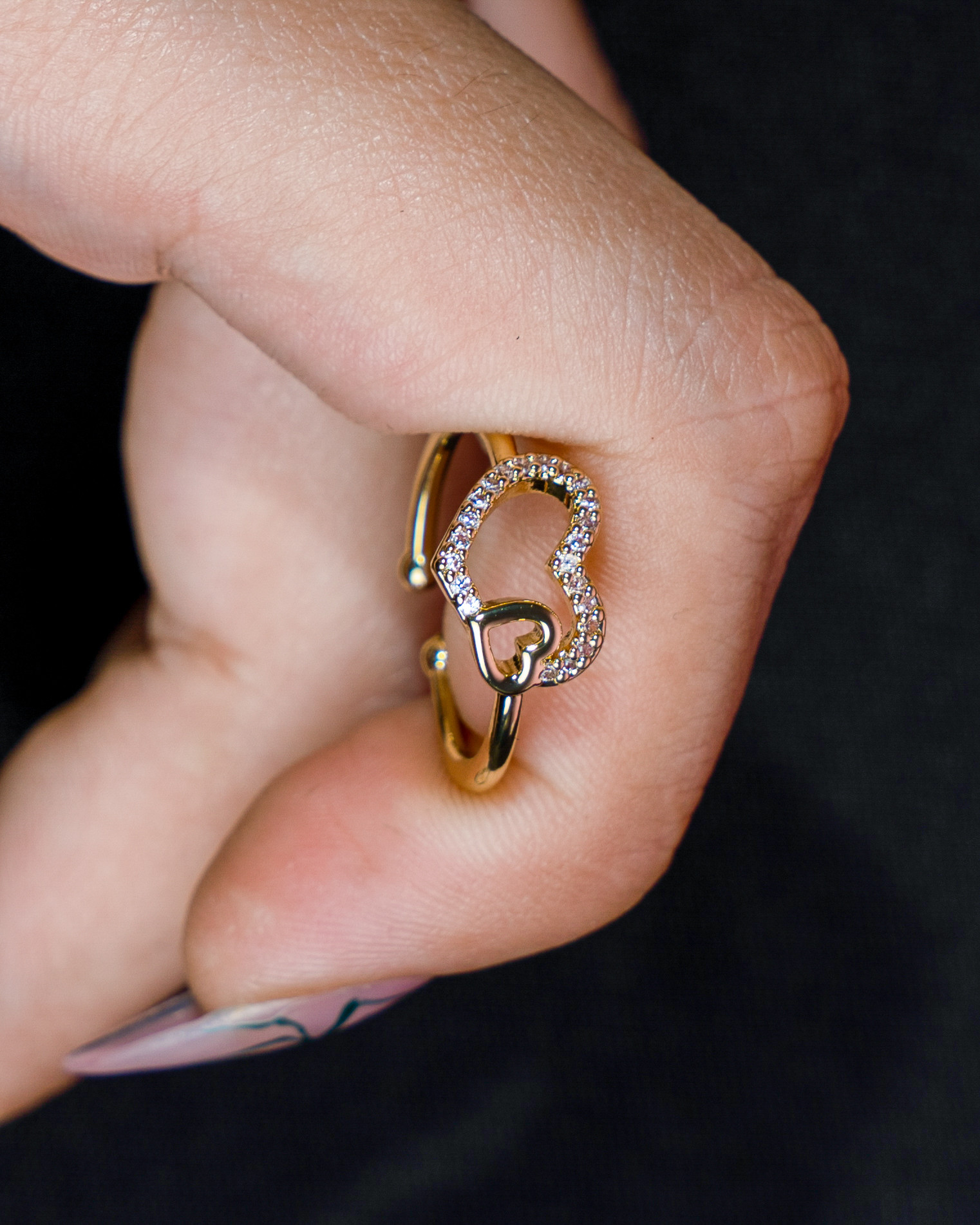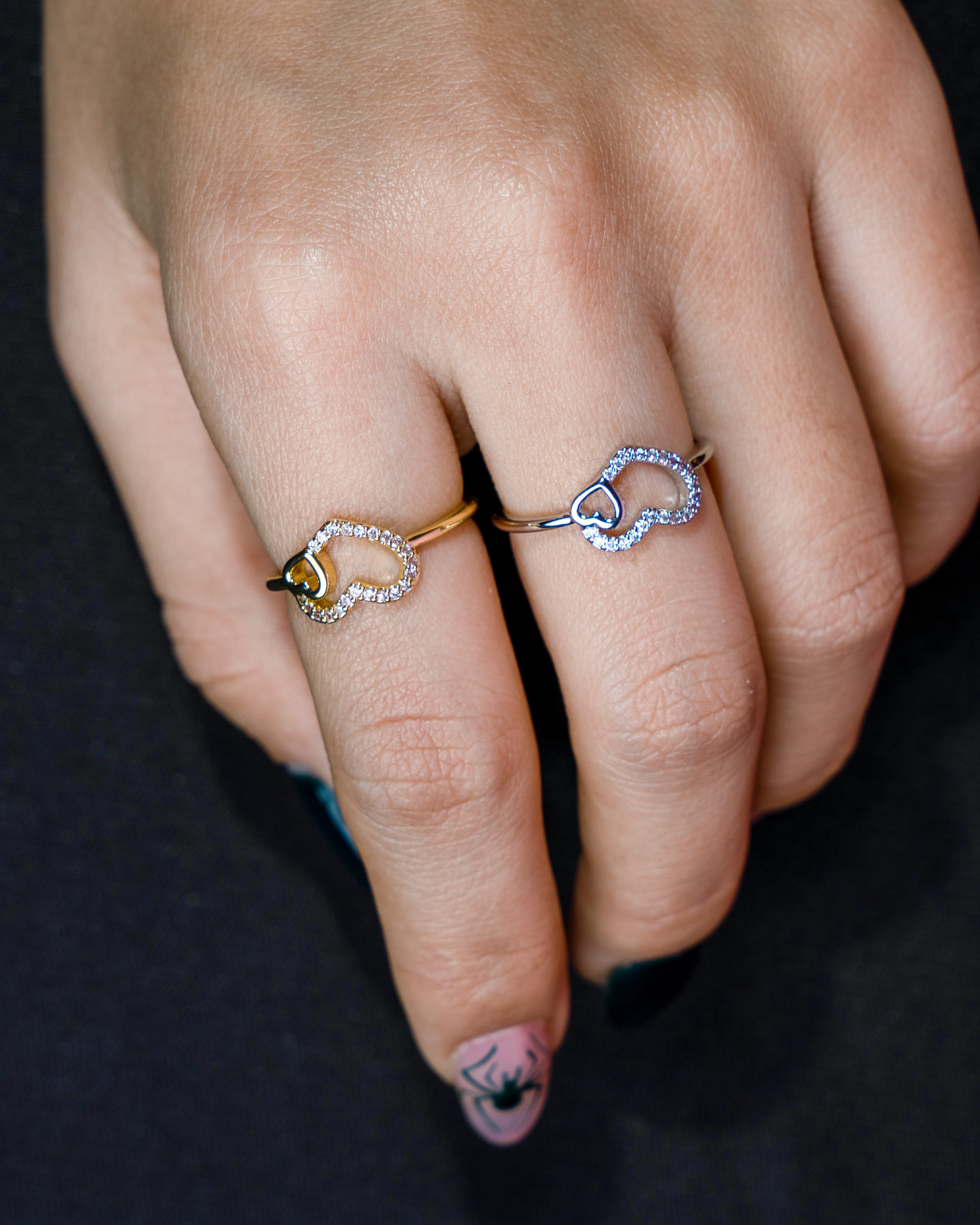 A delicate heart-shaped ring with sparkling crystal detailing, designed for everyday elegance. Crafted with a sleek gold-tone finish and a minimal open-heart motif, this ring adds a soft romantic touch to both casual and dressy looks. Lightweight, comfortable, and perfect for stacking or wearing solo.