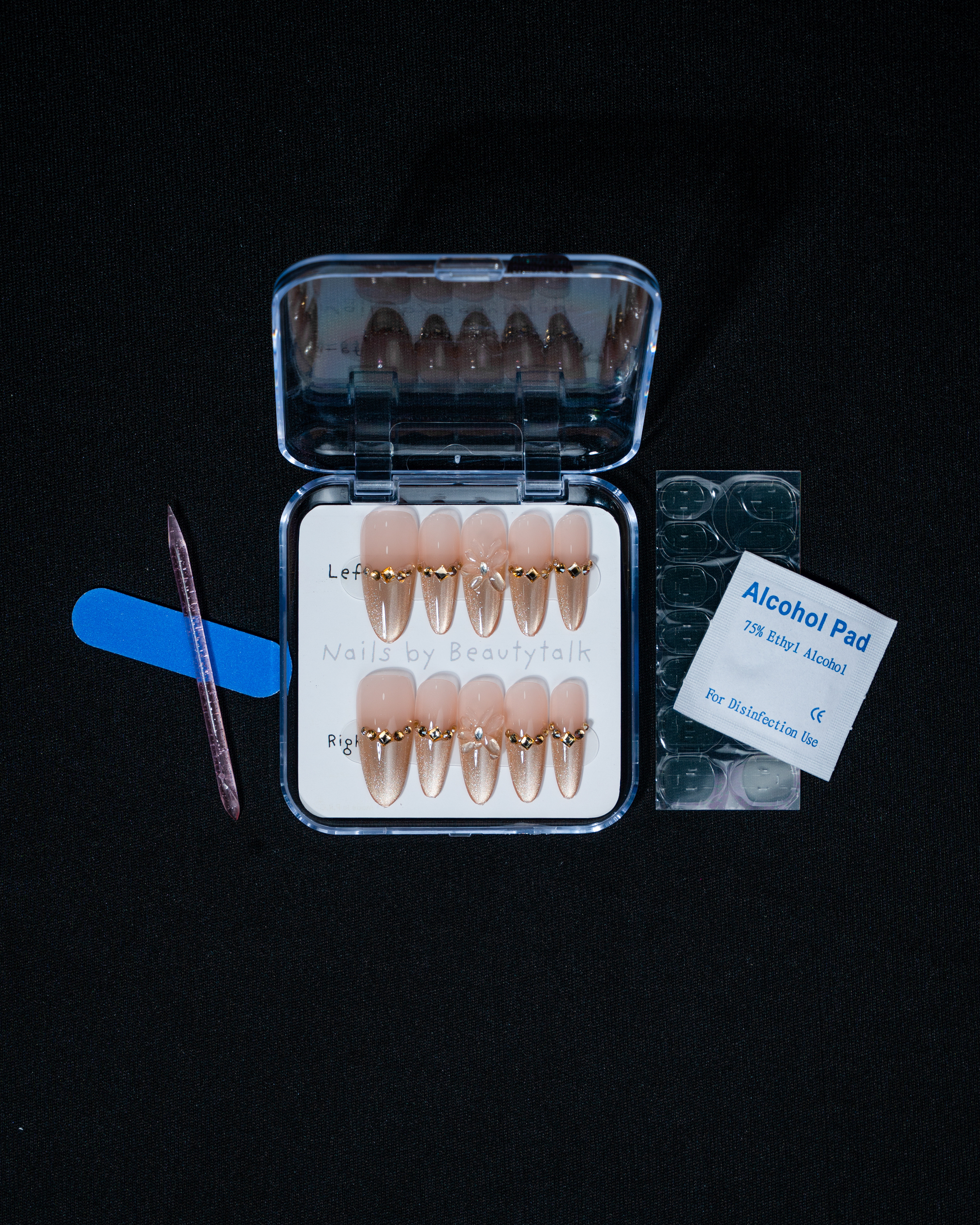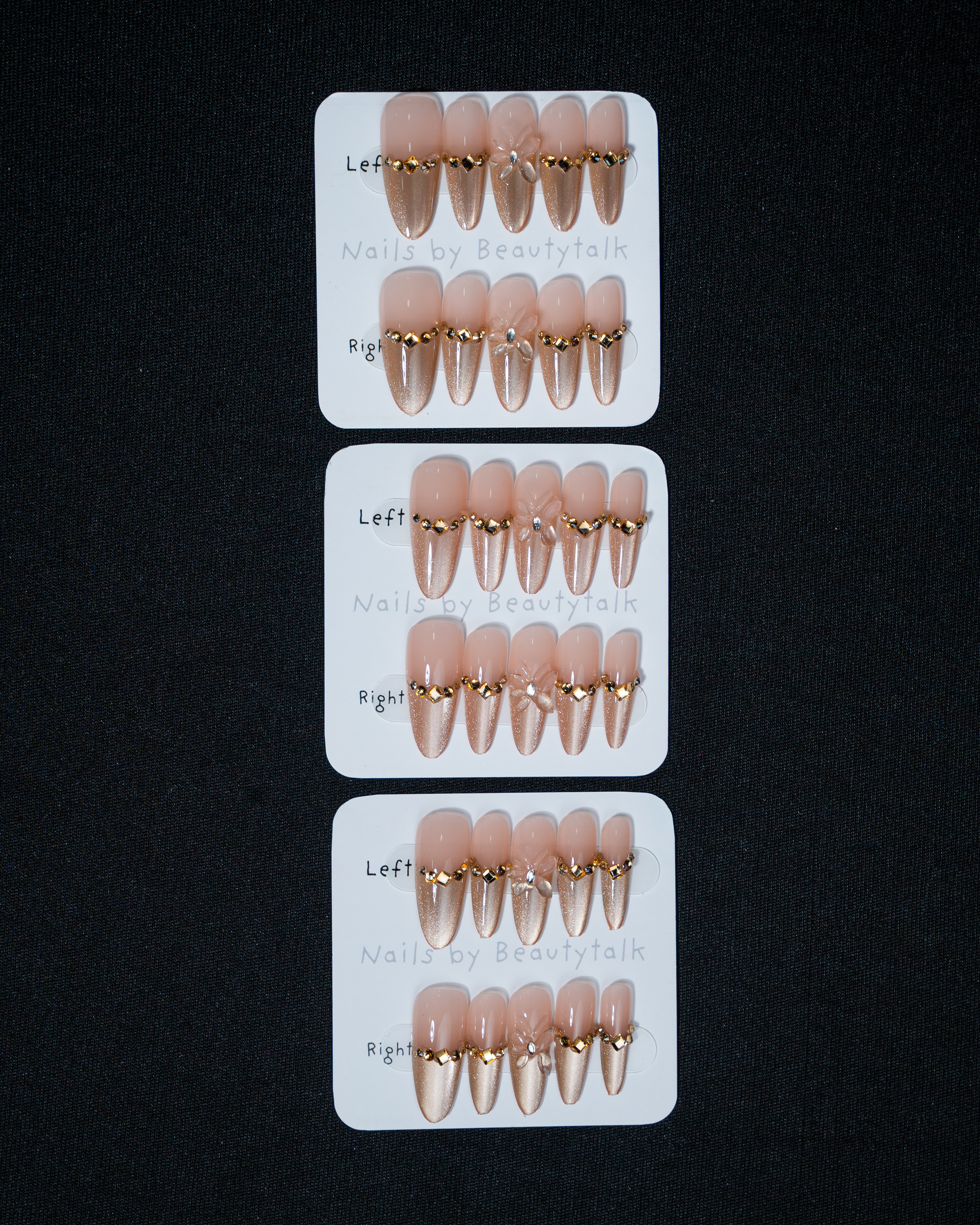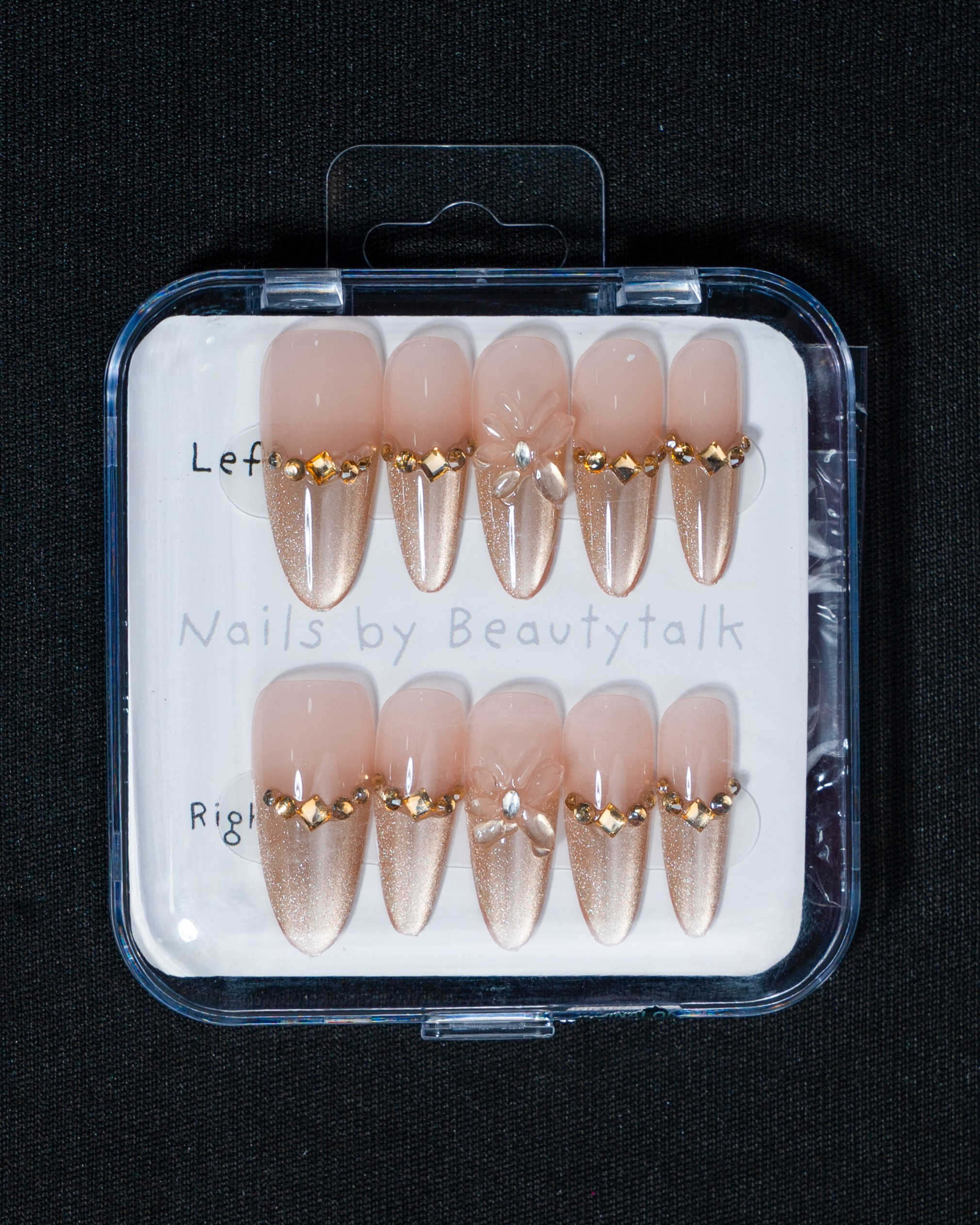 A nude press-on nail set with a glossy finish and gold-toned tips. Features rhinestone detailing and a central bow accent.