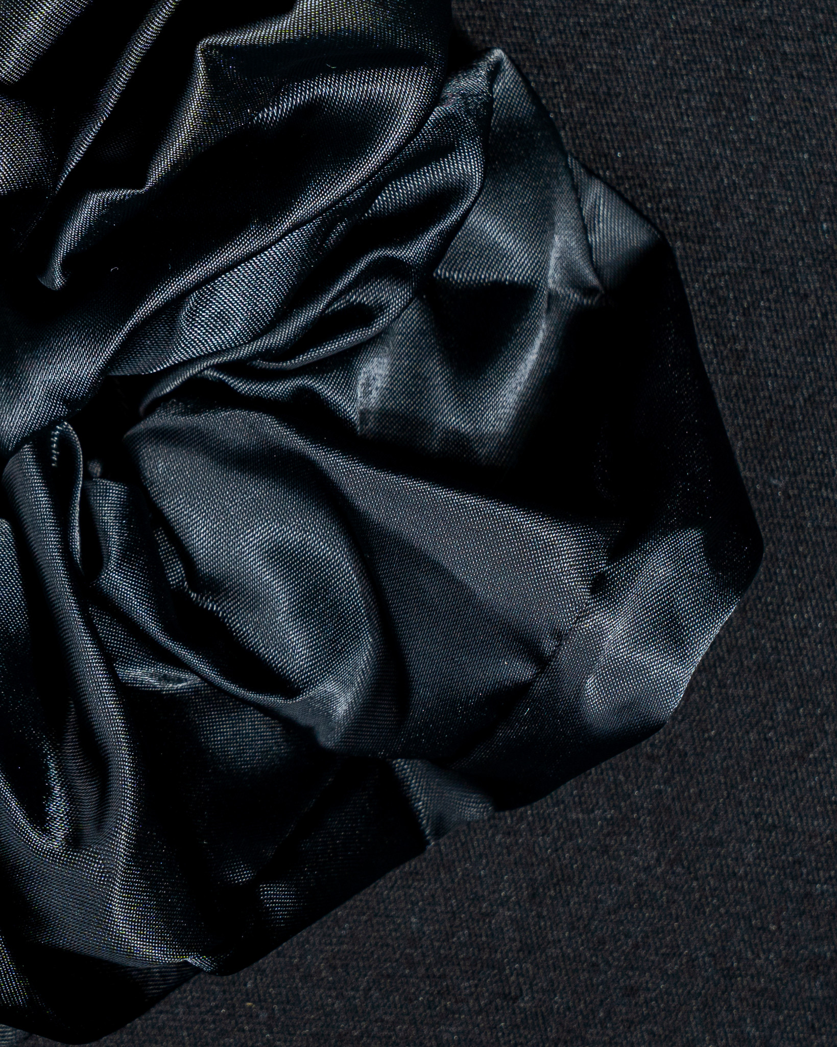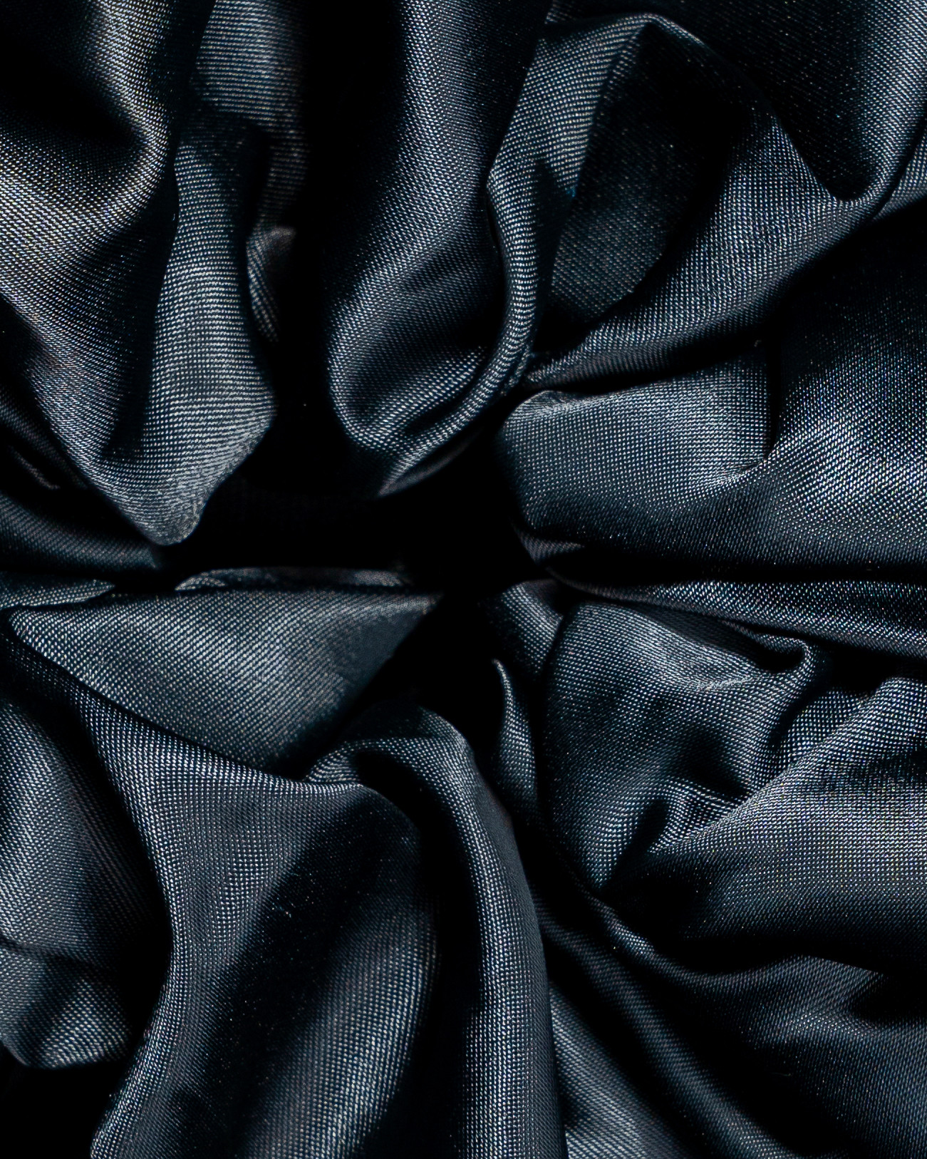 A sleek black scrunchie crafted in a smooth satin finish, offering a glossy, refined look. Its timeless design adds effortless elegance, making it perfect for both everyday wear and elevated styling.