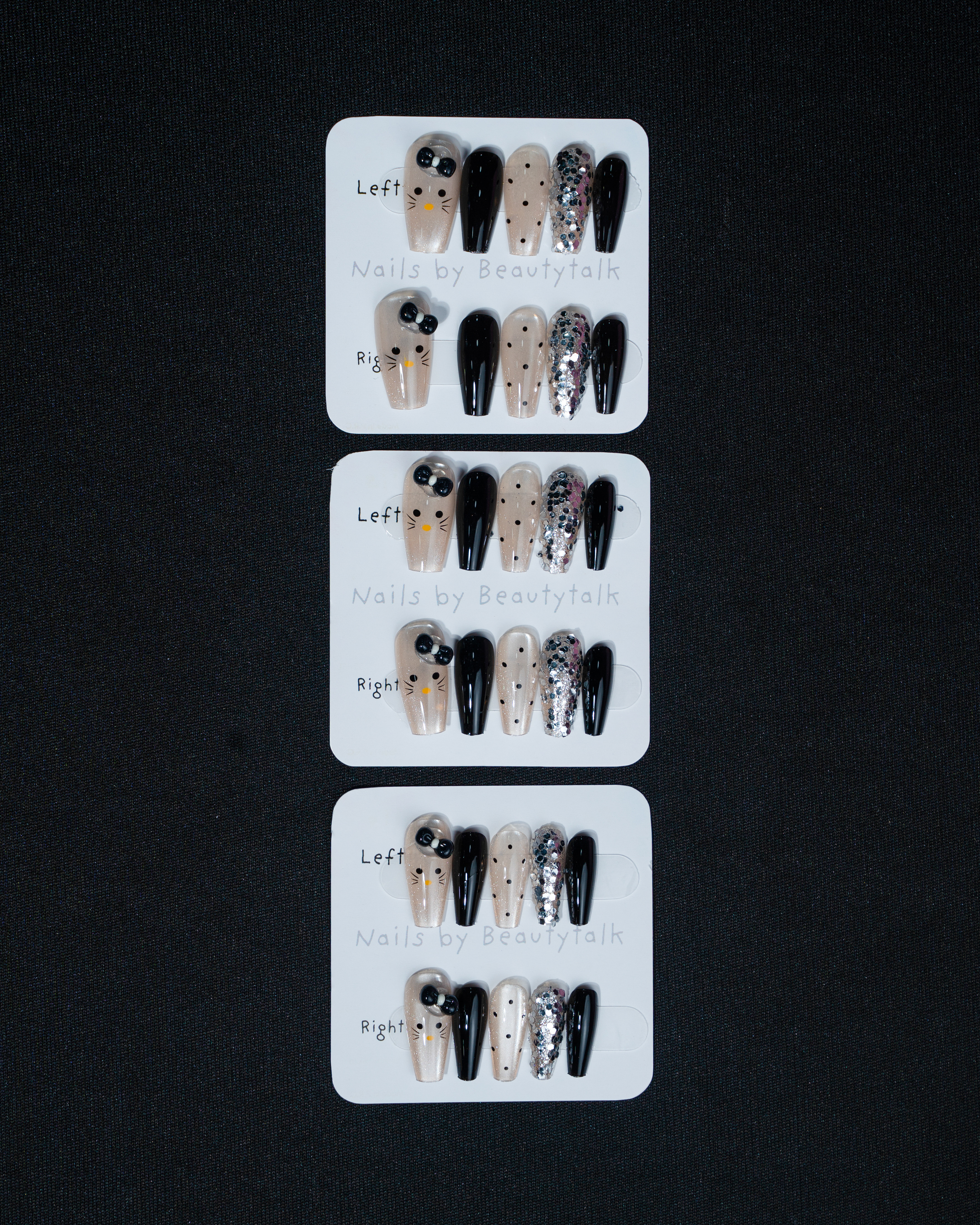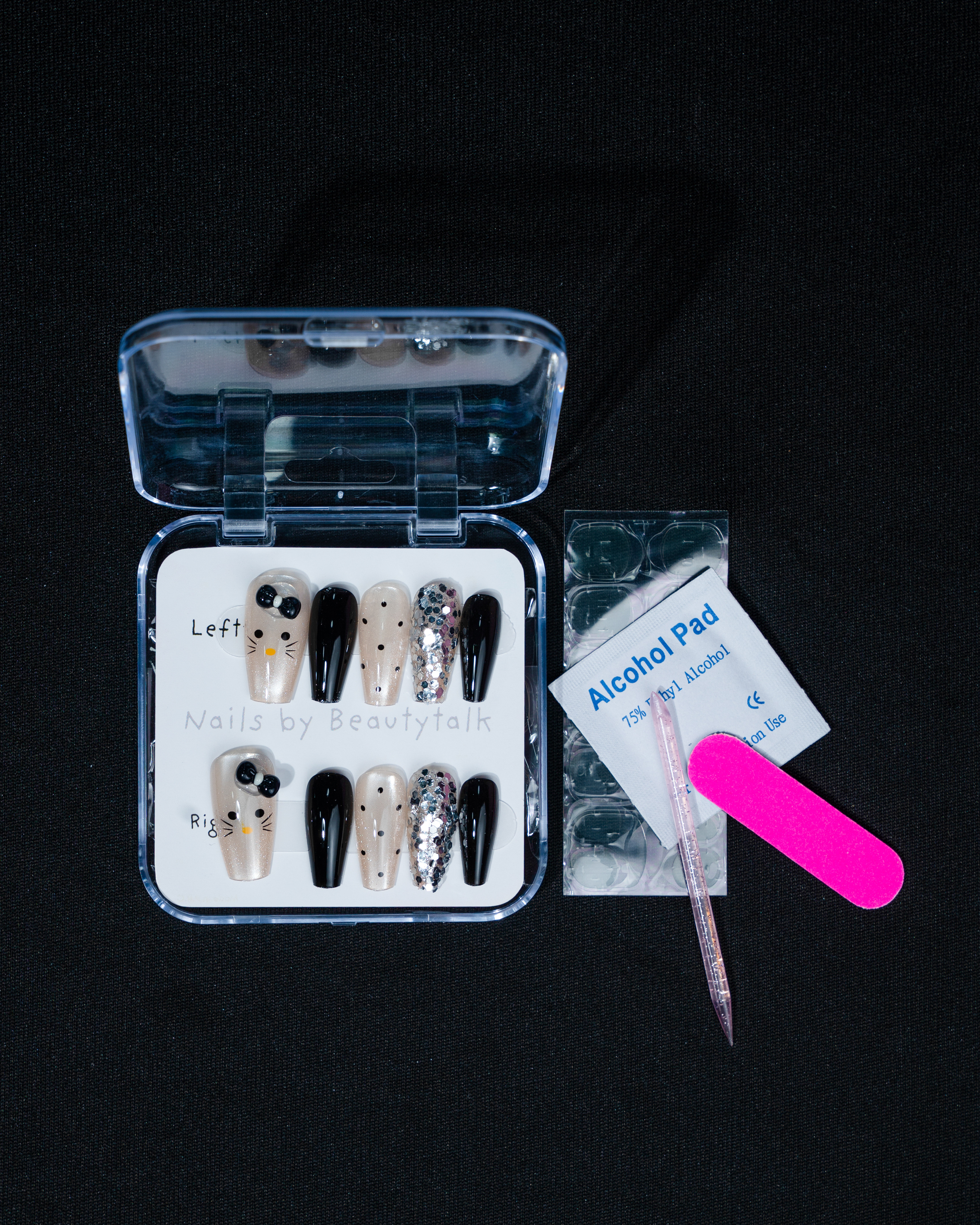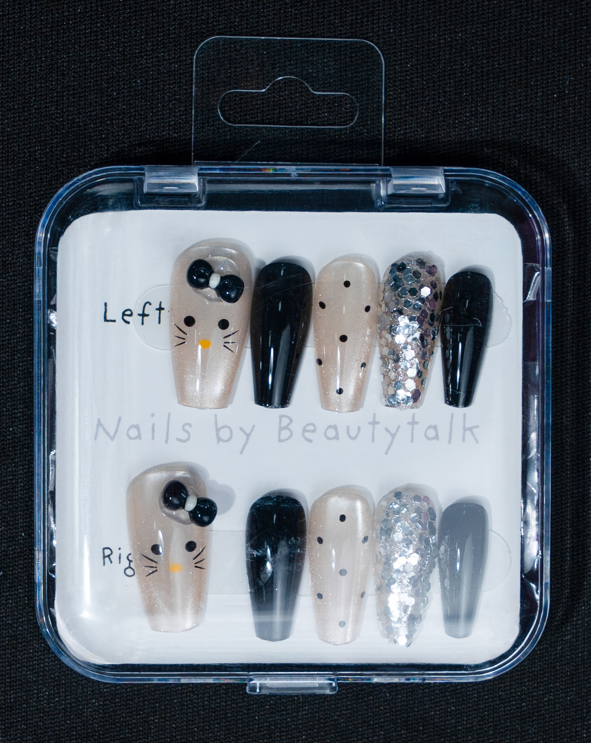 A black and nude press-on nail set with a glossy finish. Features glitter detailing, minimal patterns, and crystal accents.