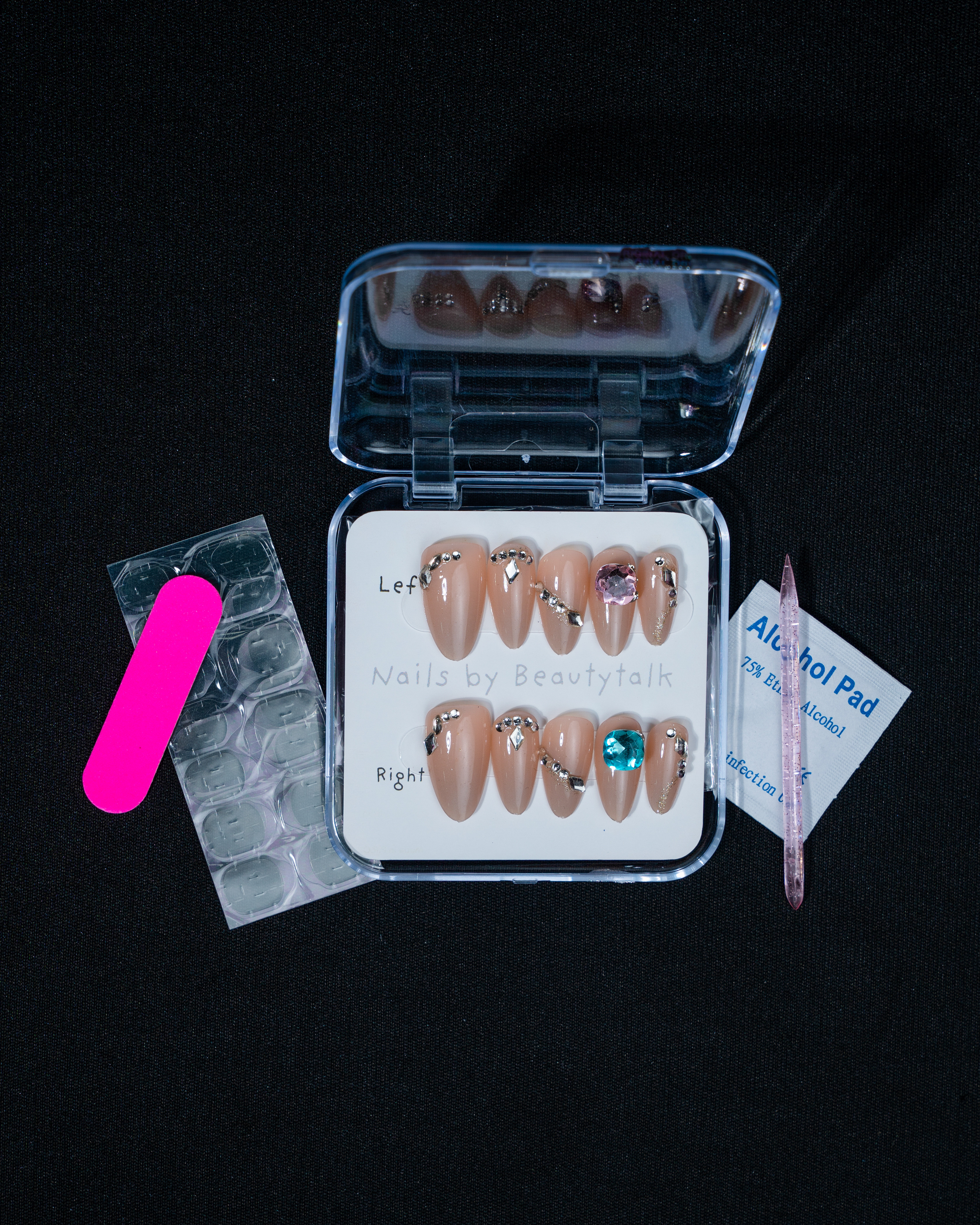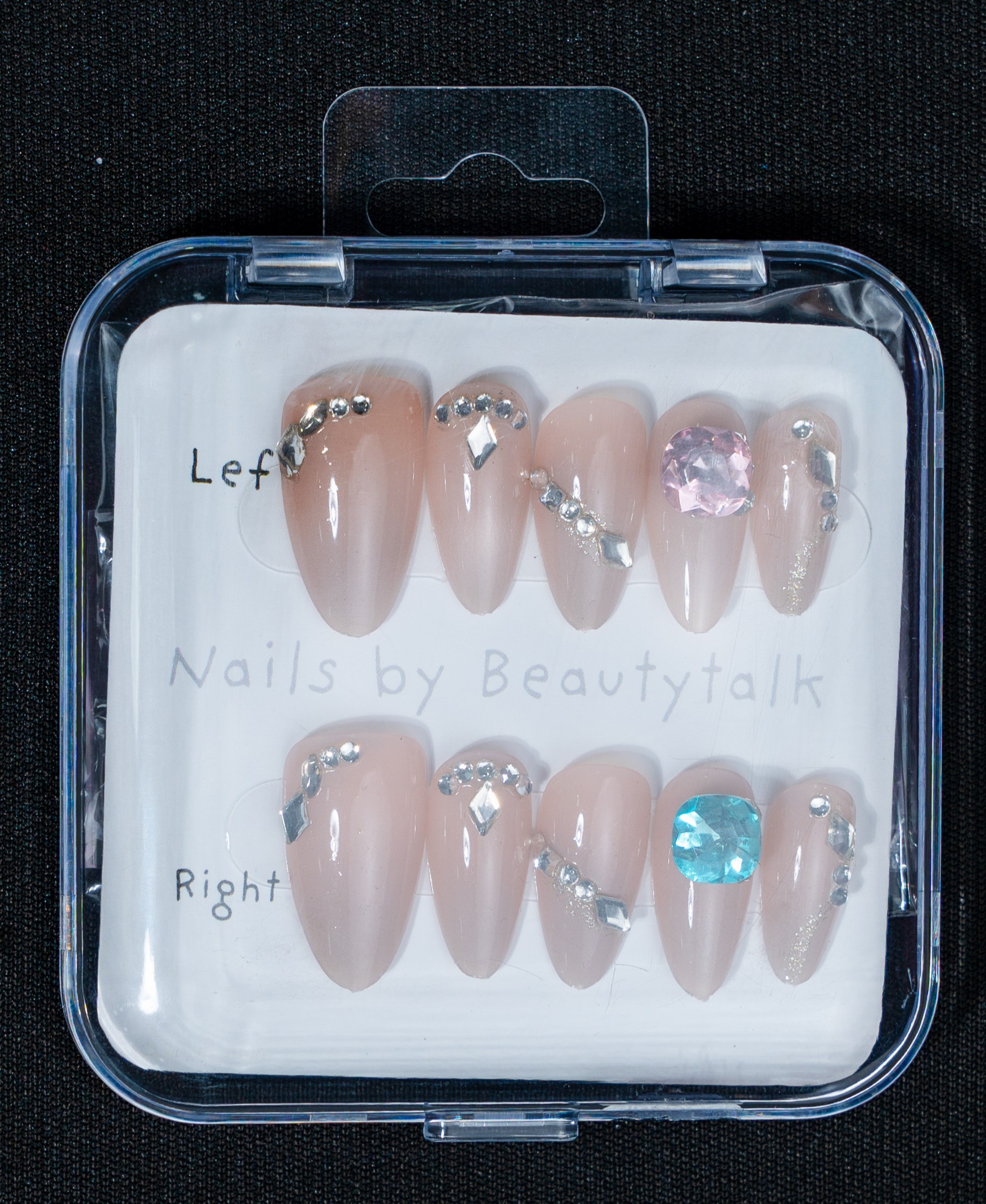A nude press-on nail set with a glossy finish. Features rhinestone detailing and statement crystal accents for a clean, embellished look.