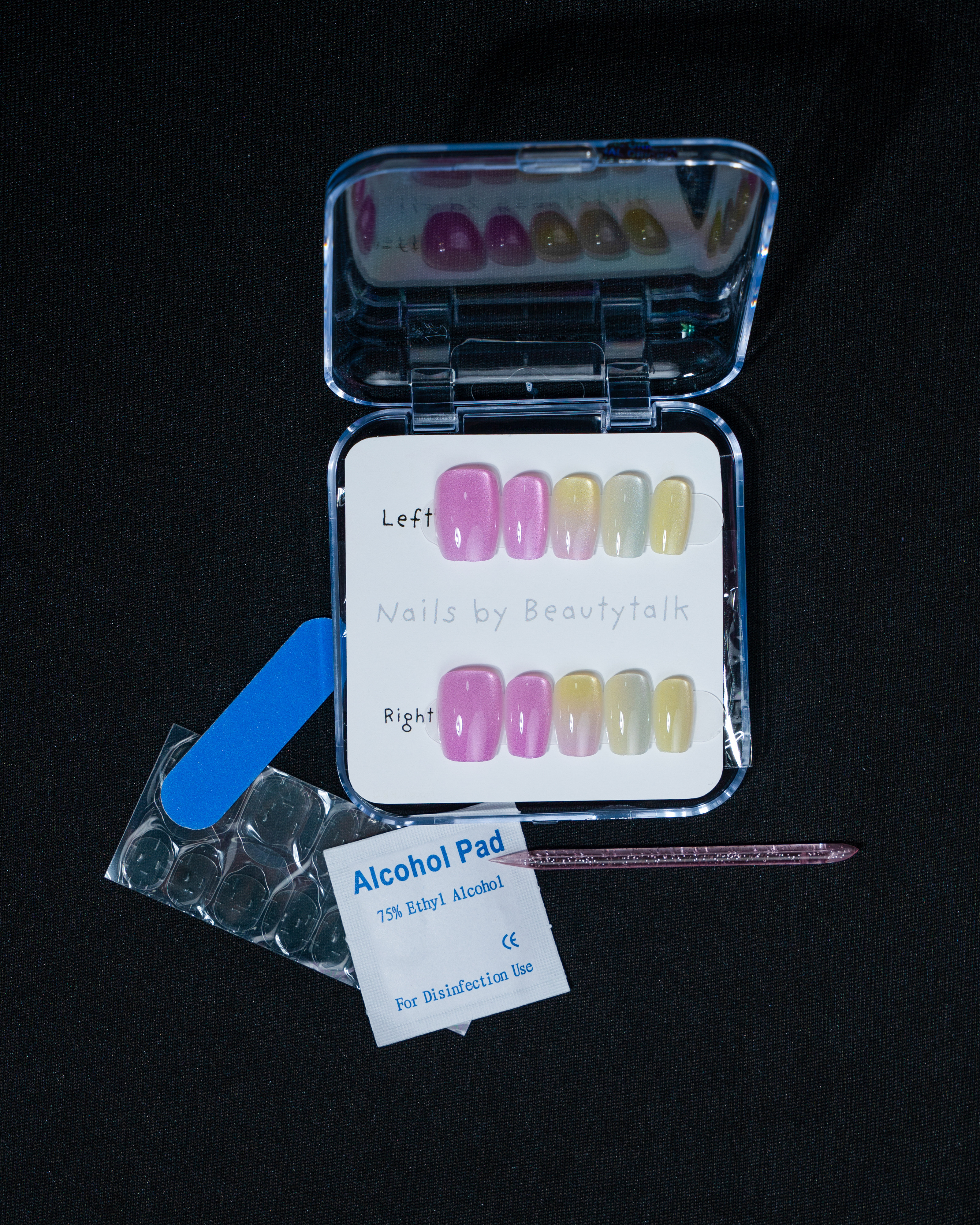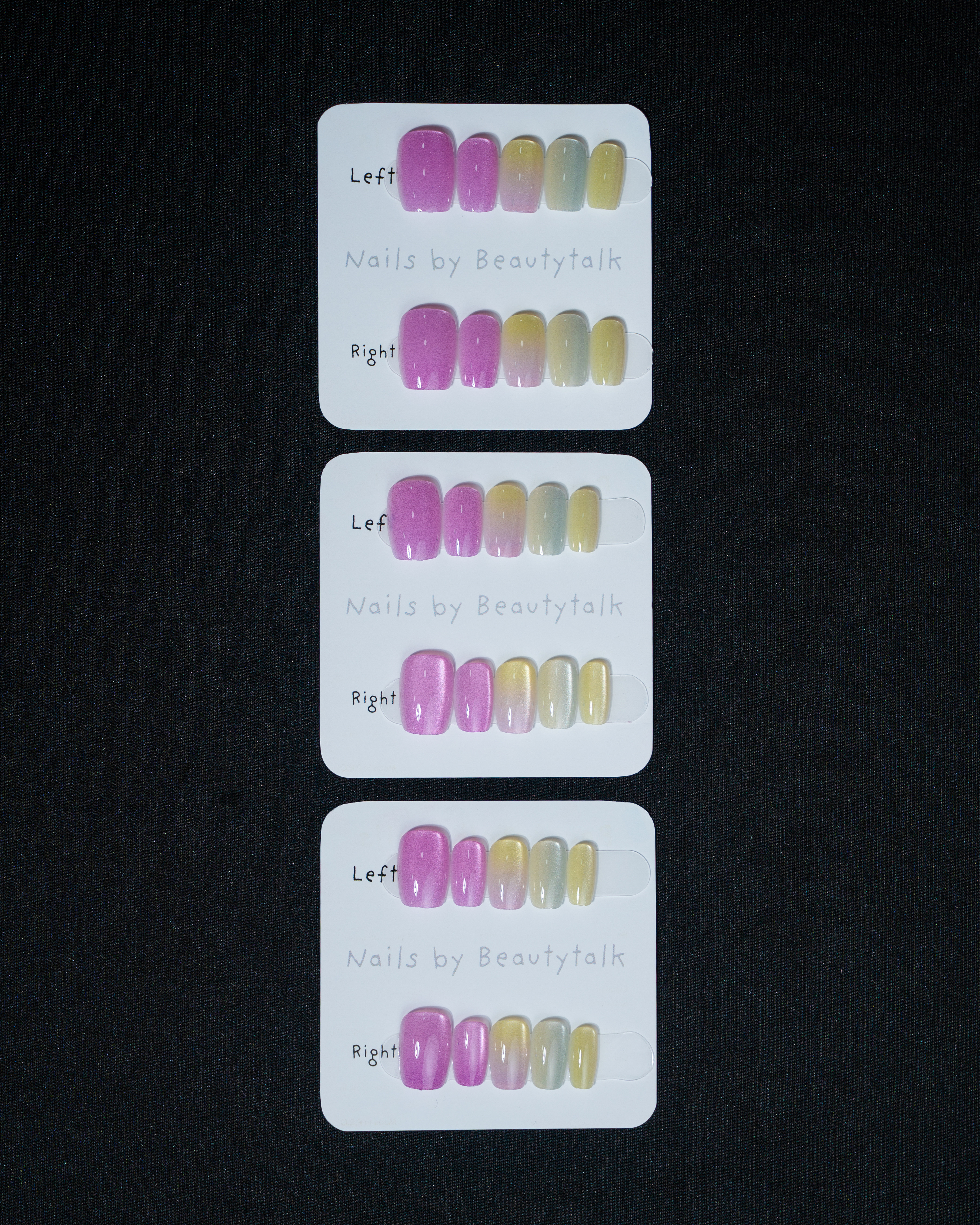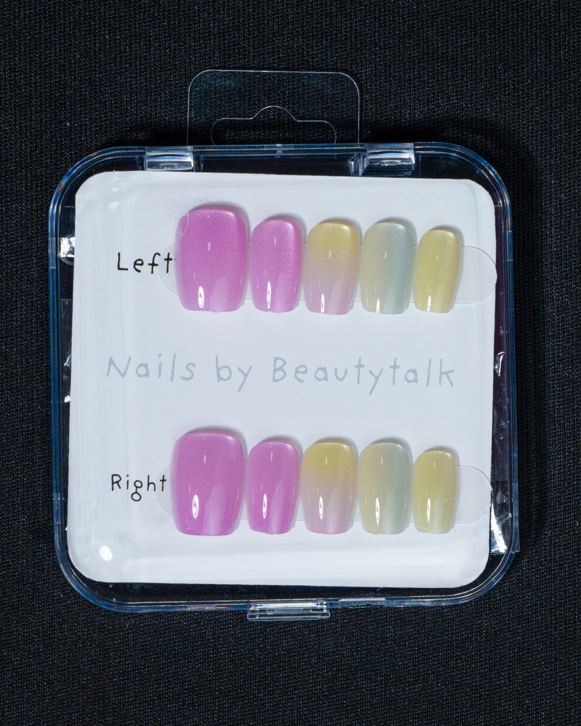 A pastel press-on nail set with a glossy finish. Features soft color gradients with a subtle shimmer effect.