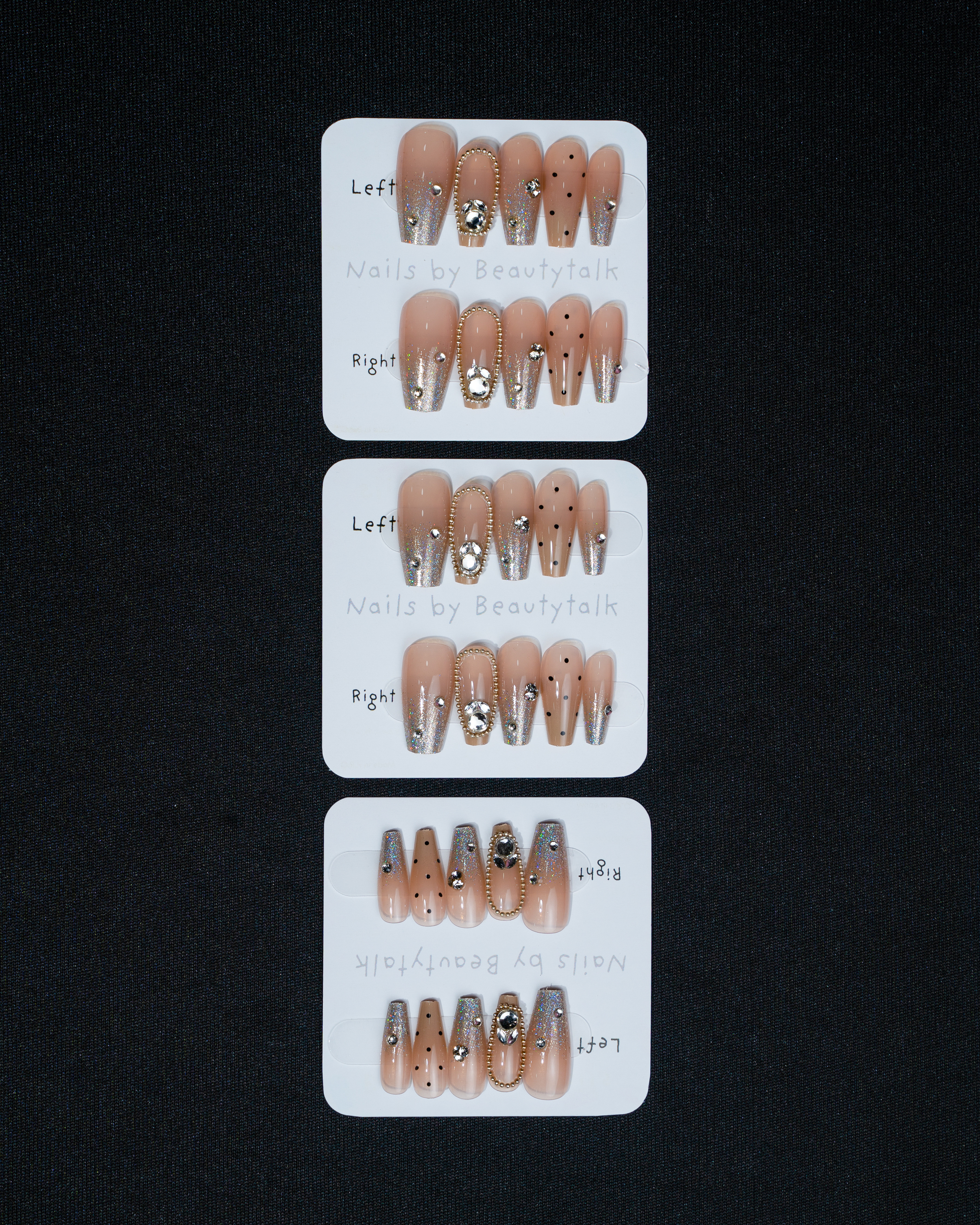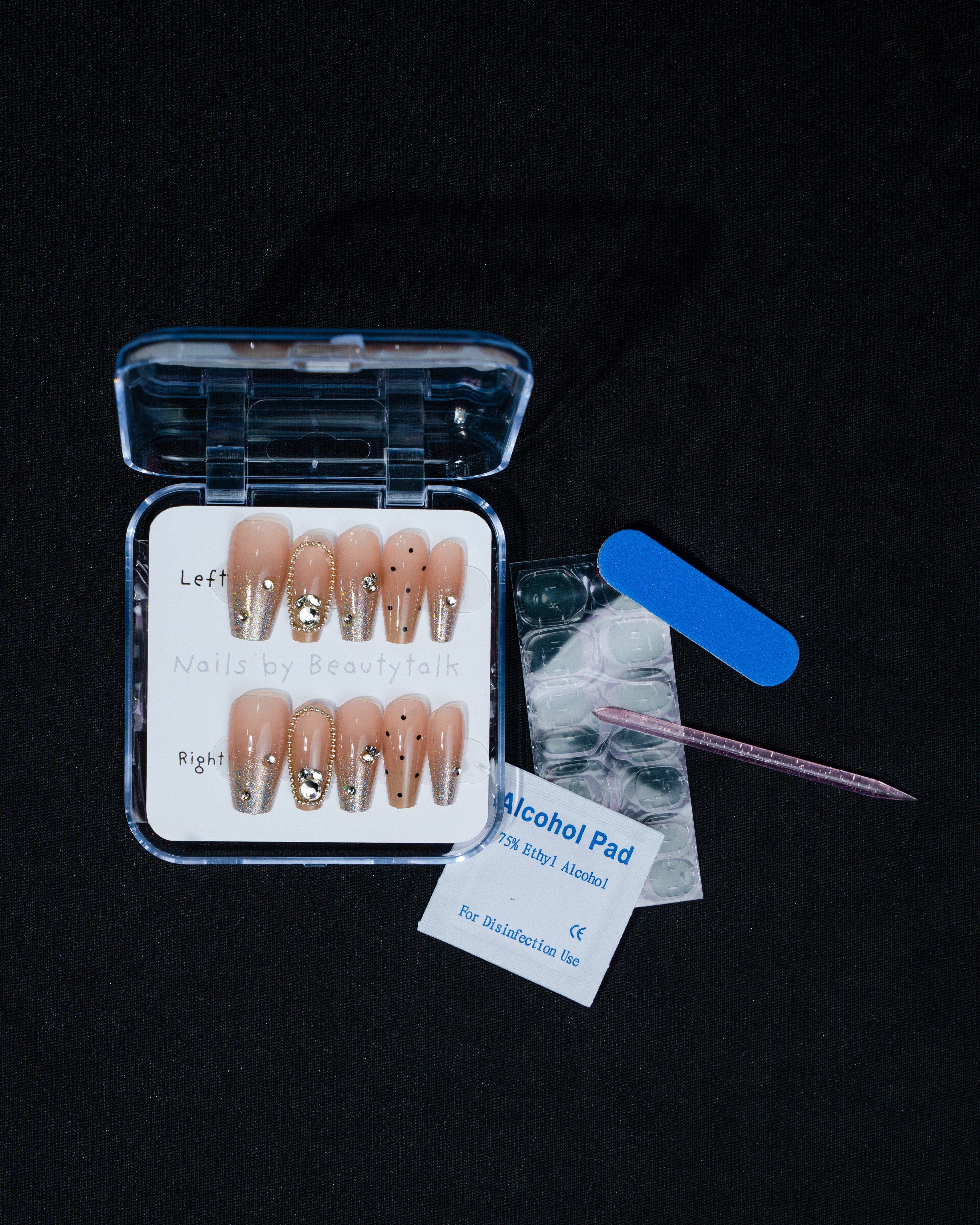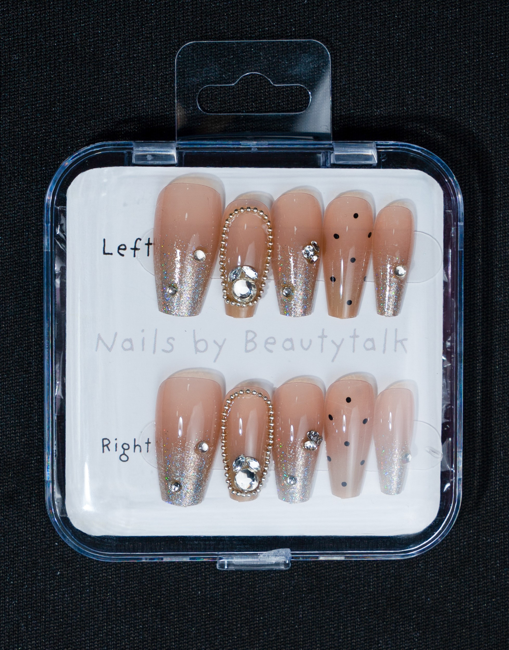 A peach-toned press-on nail set with a glossy finish. Features glitter tips, rhinestone detailing, and minimal dot accents.