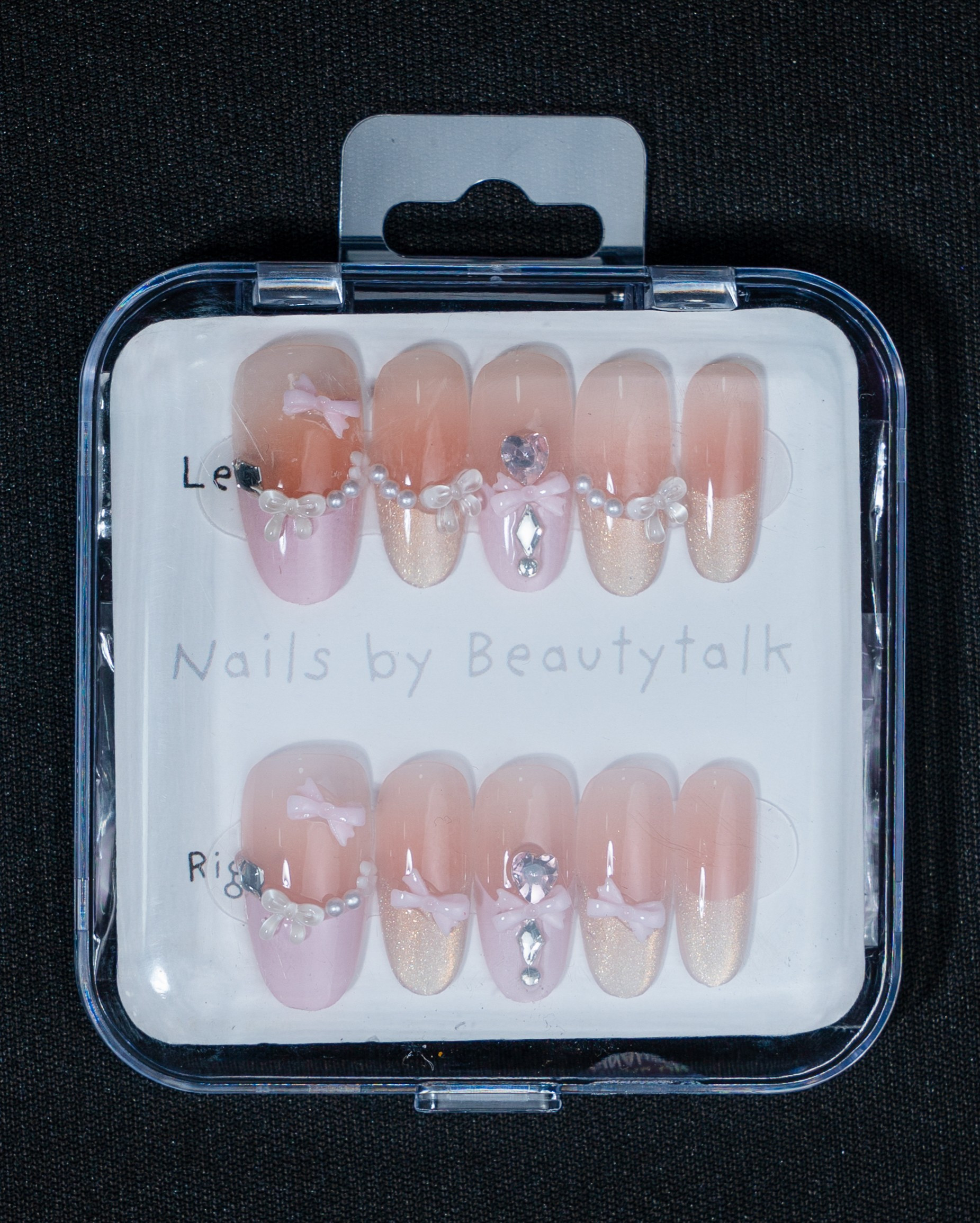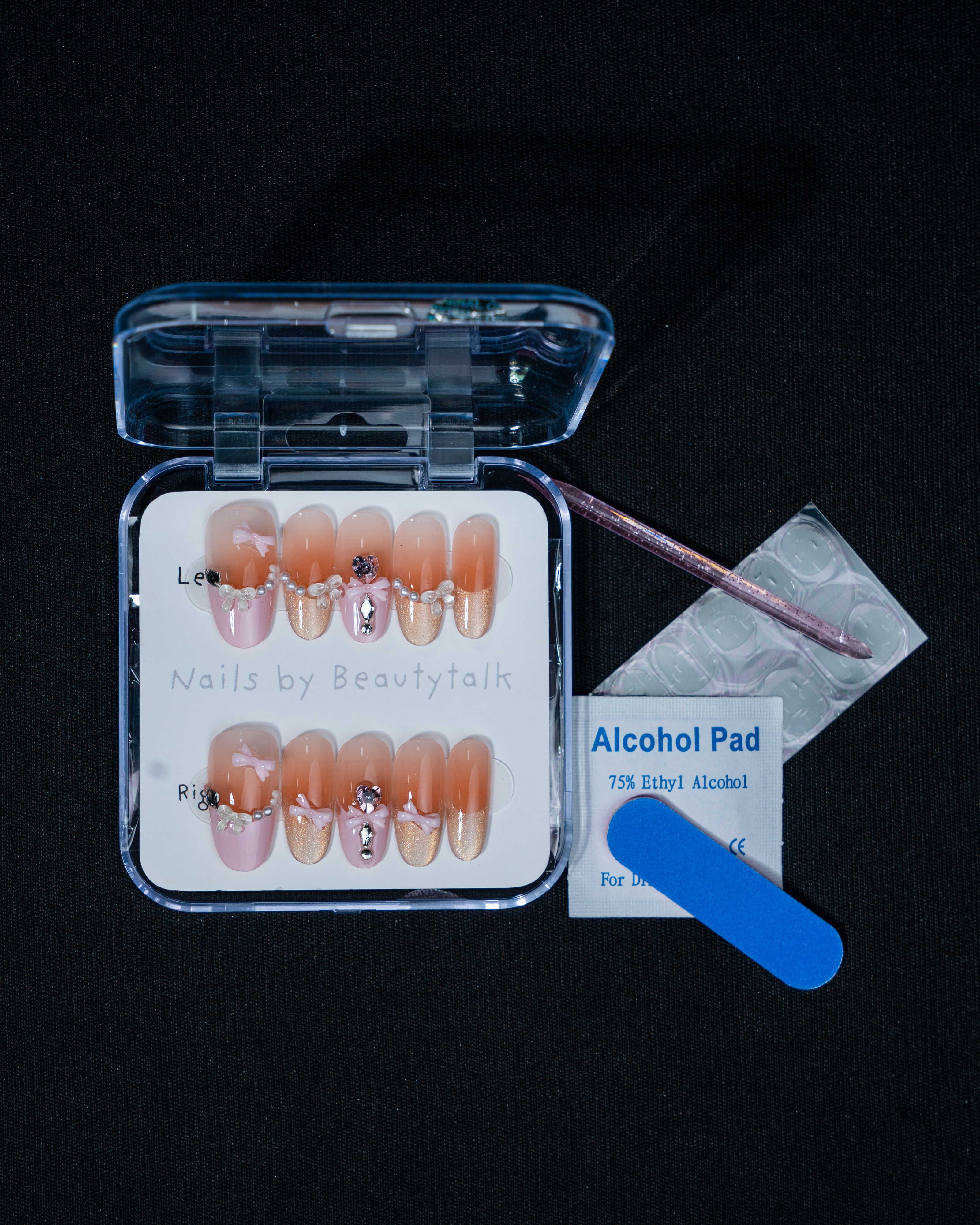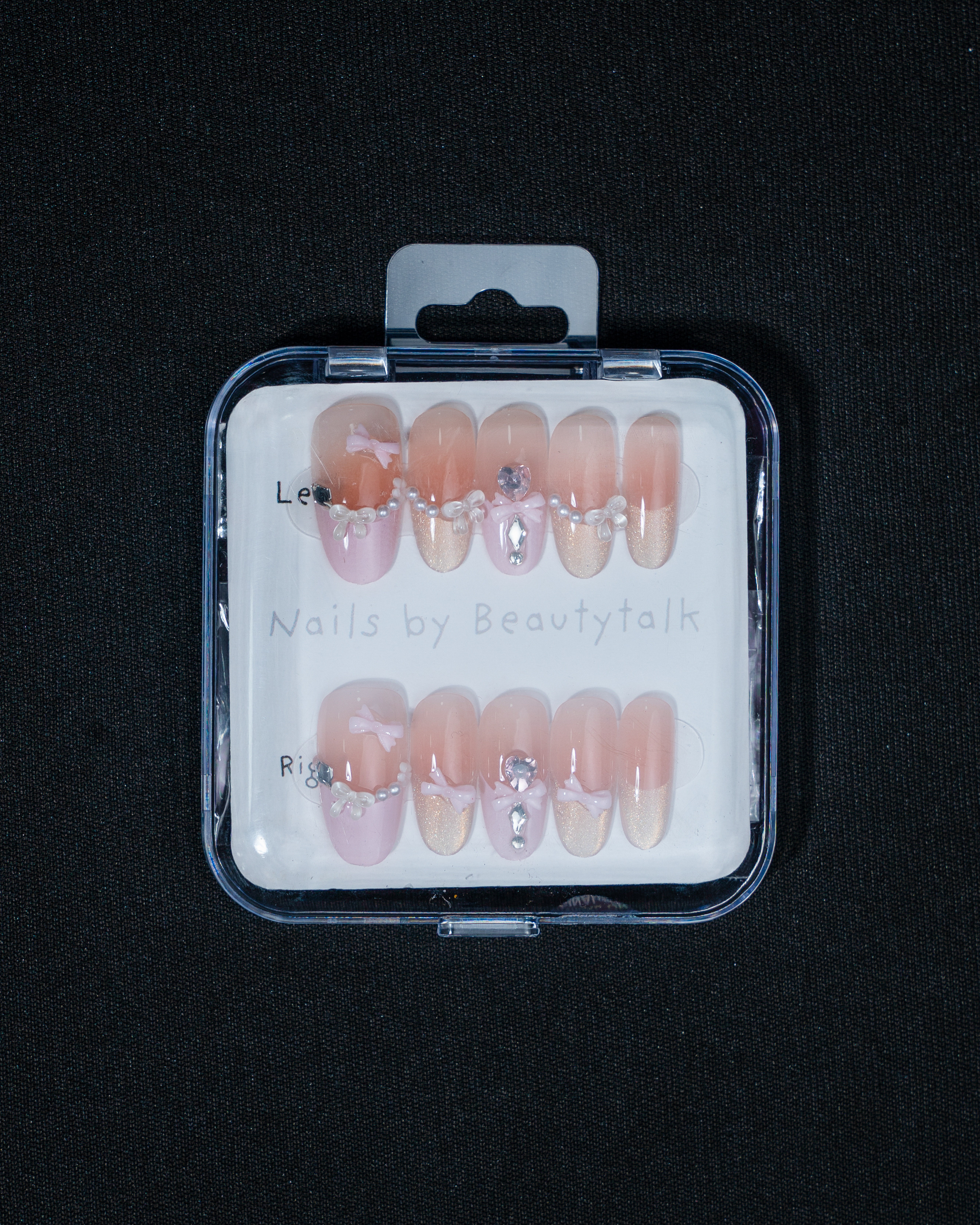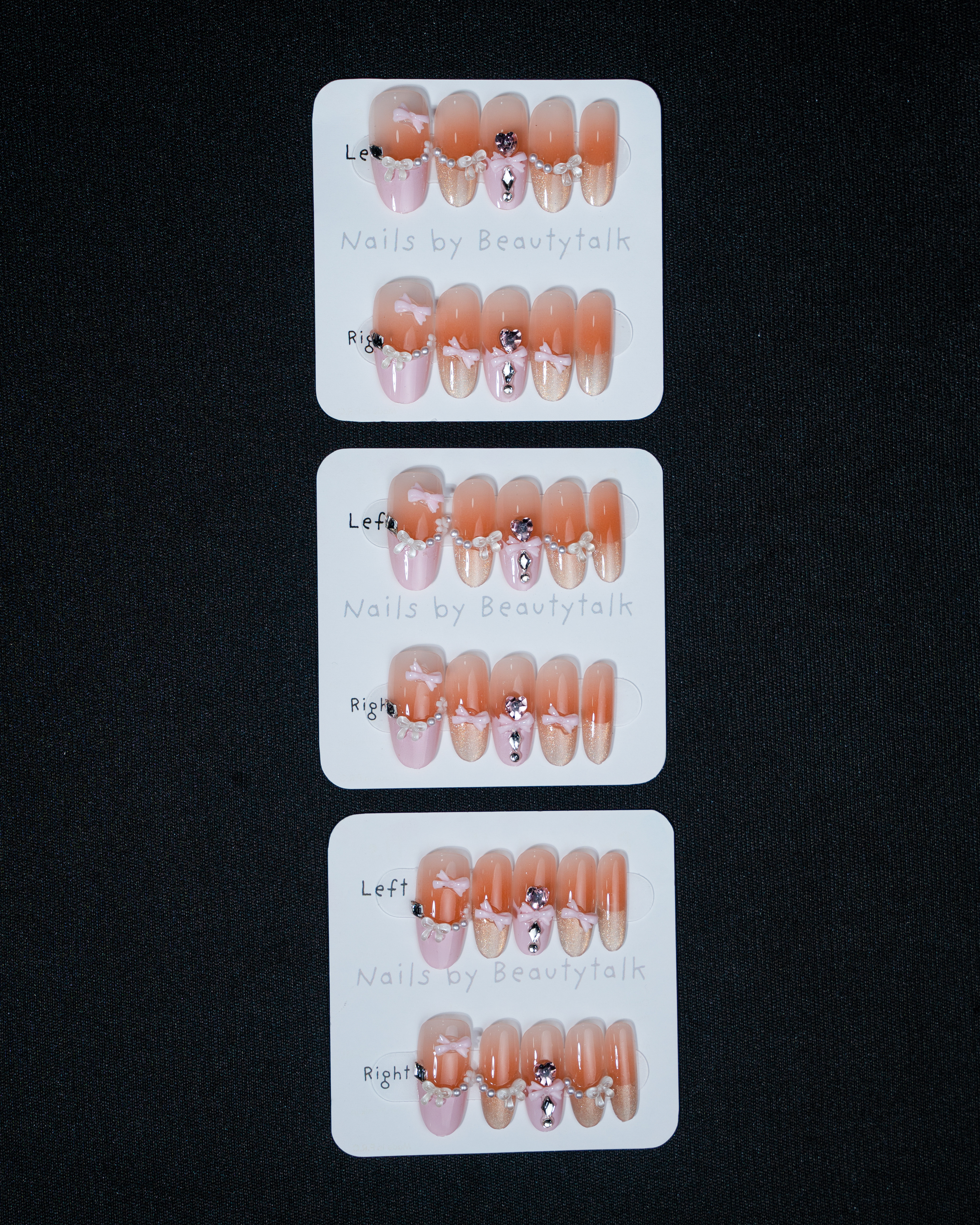 A peach-toned press-on nail set with a soft ombré French finish. Features pearl detailing, bow accents, and subtle glitter tips.