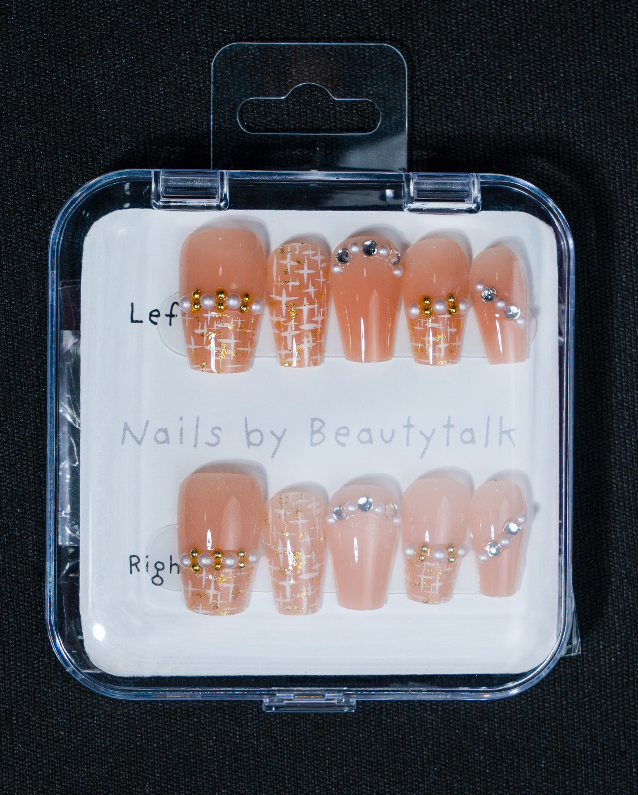 A peach-toned nude press-on nail set with subtle French-style detailing, gold accents, and small rhinestone embellishments. Designed for a neat, polished look suitable for everyday wear or occasions.