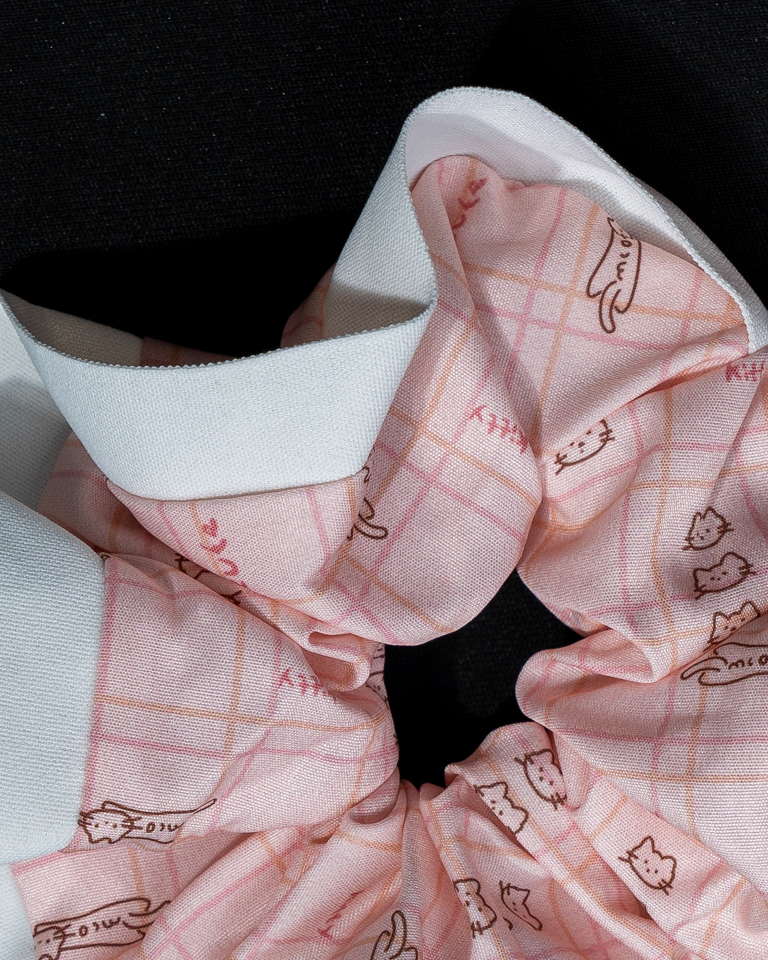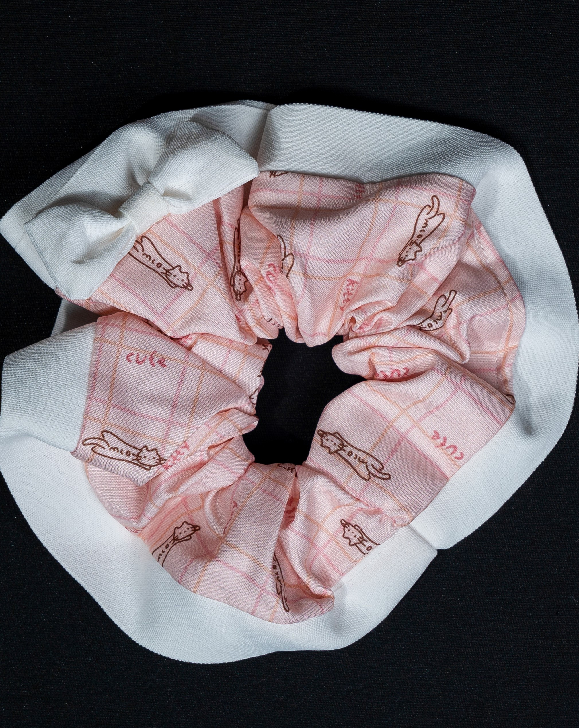 A cute peach-toned scrunchie with a soft check pattern and playful kitty prints, finished with a clean white border and a tiny bow detail. Its fun and girly design adds a lighthearted, charming touch to your everyday look.