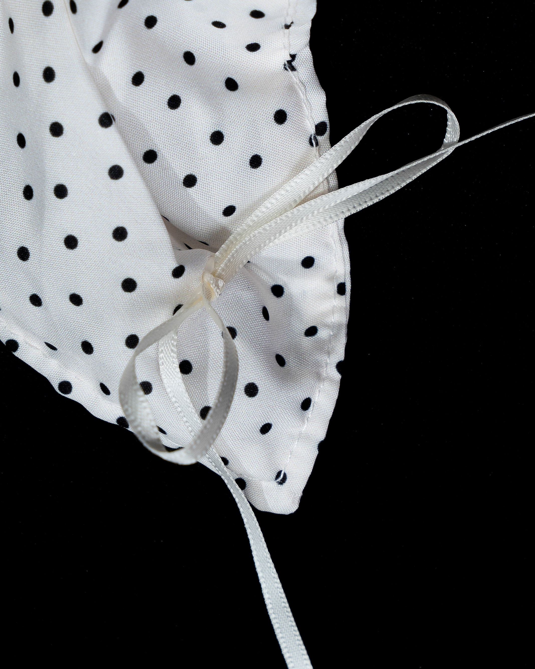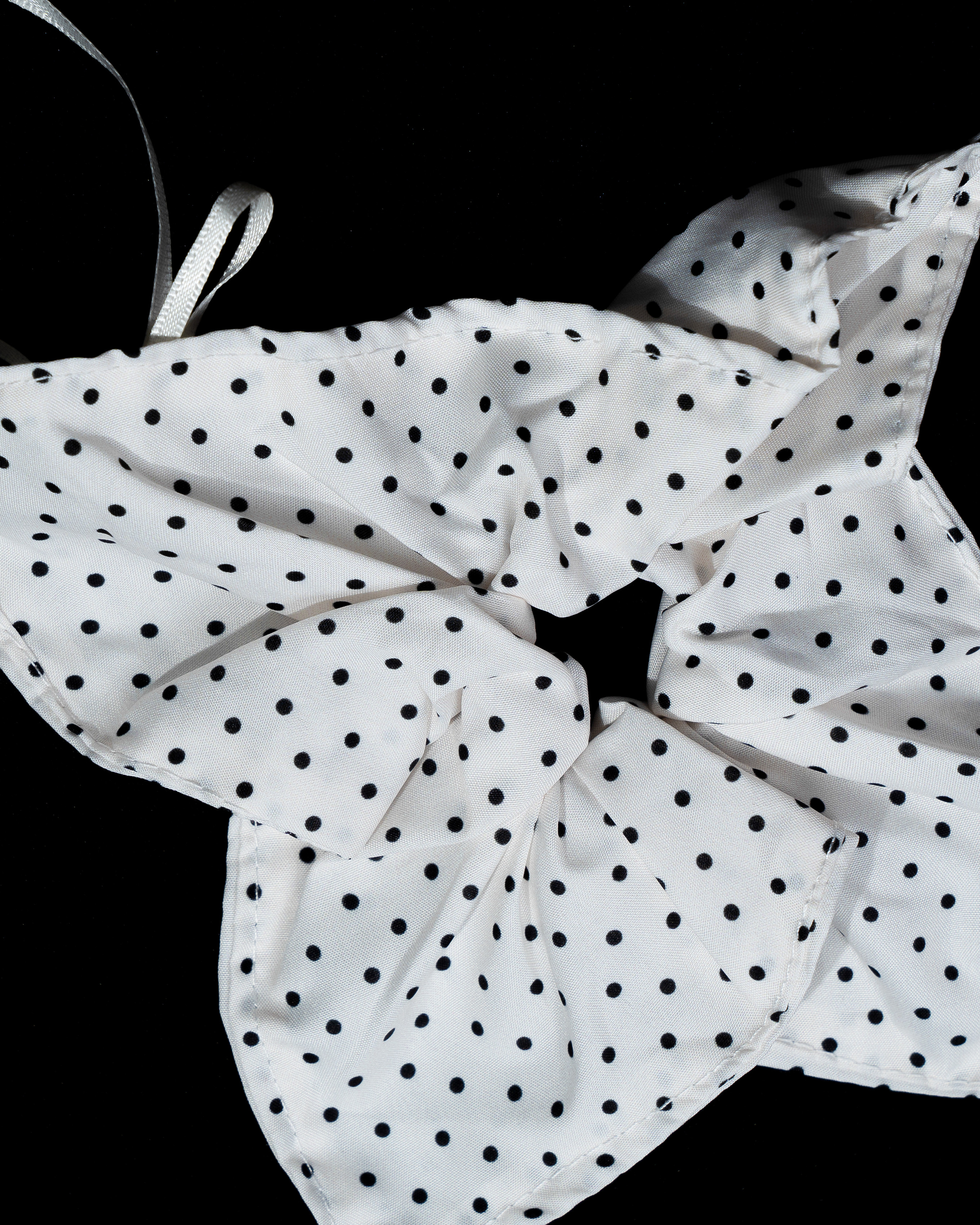 A chic white scrunchie with tiny black polka dots, finished with a soft bow detail for a classic, feminine look. Its timeless pattern paired with the bow adds a playful yet elegant charm to any hairstyle.