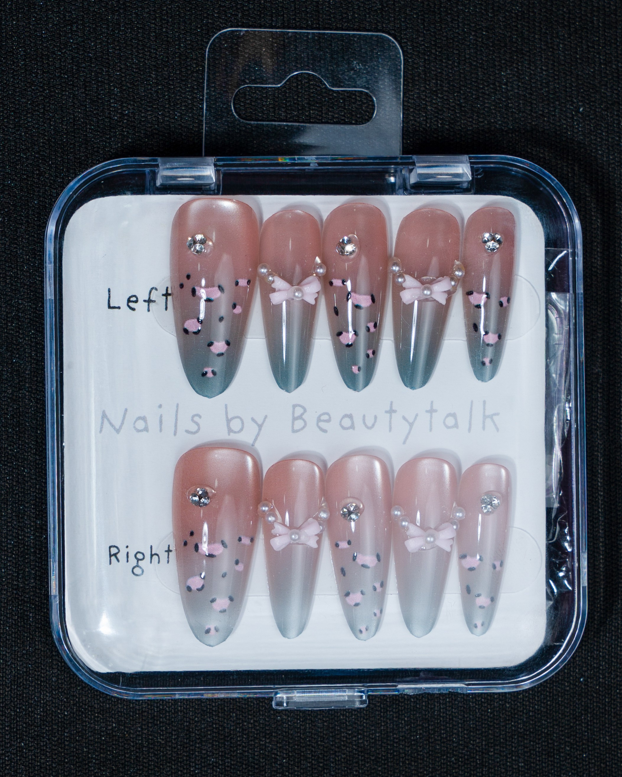 A nude and soft pink press-on nail set with a glitter fade effect. Features rhinestones and small bow embellishments with a metallic tip detail.