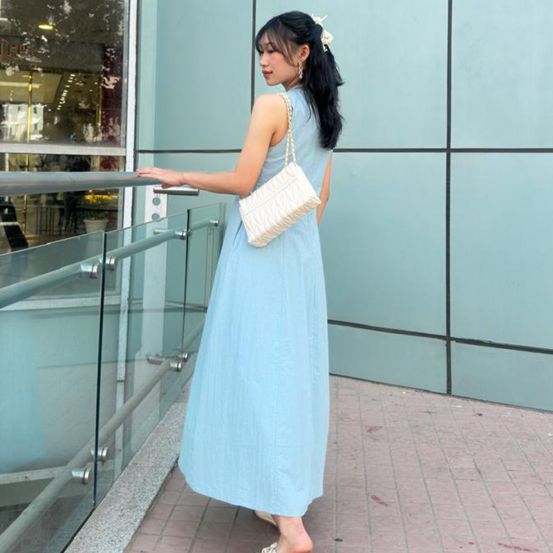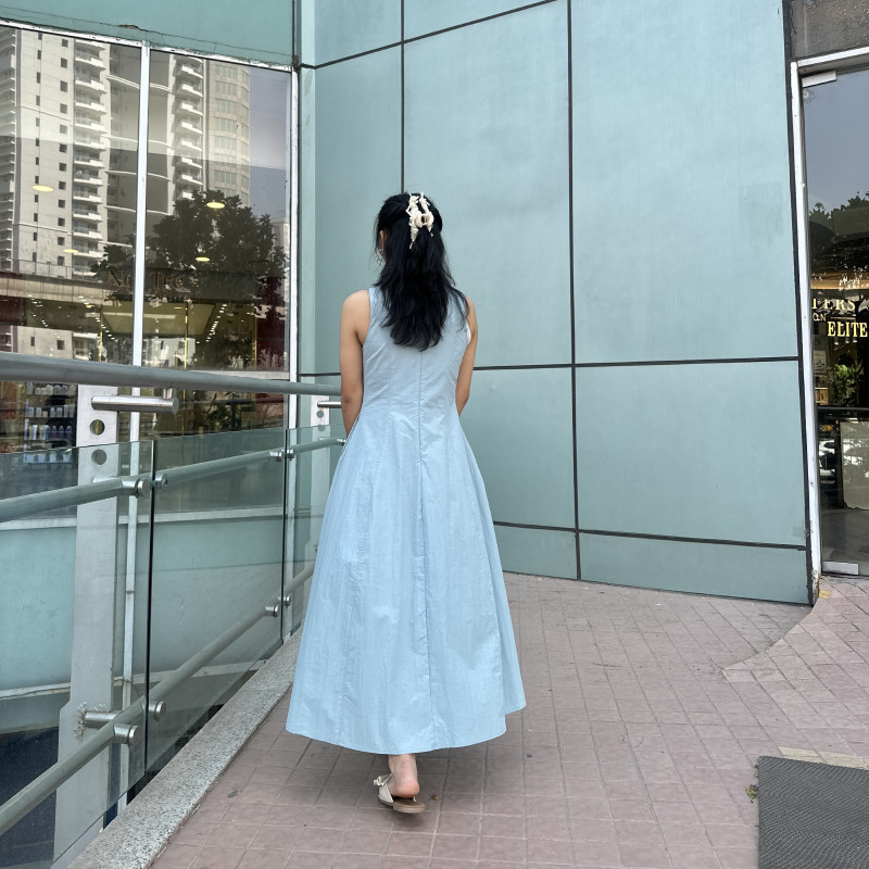 Denim Print: A unique fabric design featuring a denim-inspired print, giving the dress the look of denim without the weight or stiffness of traditional denim. This adds a casual yet stylish vibe to the overall appearance.