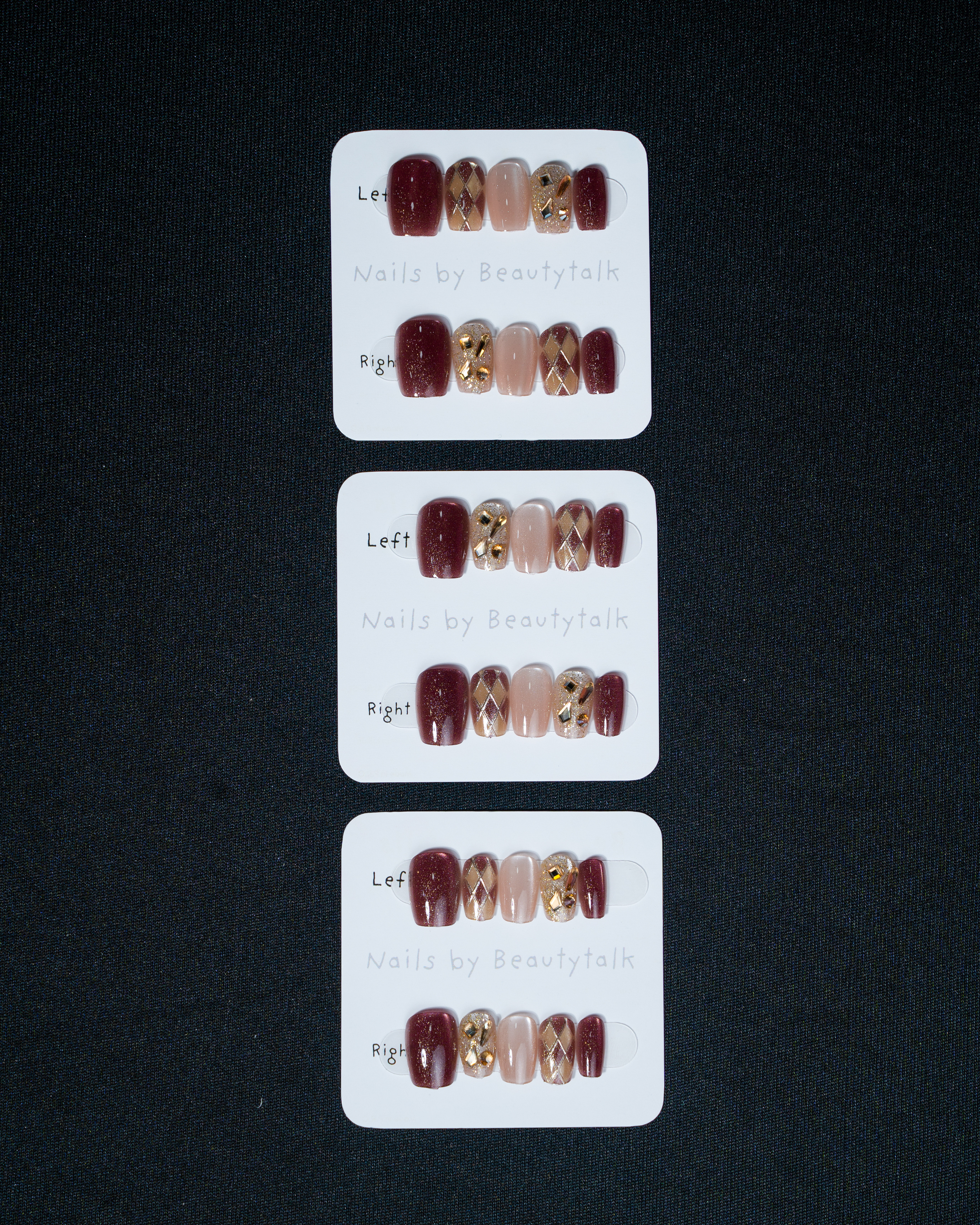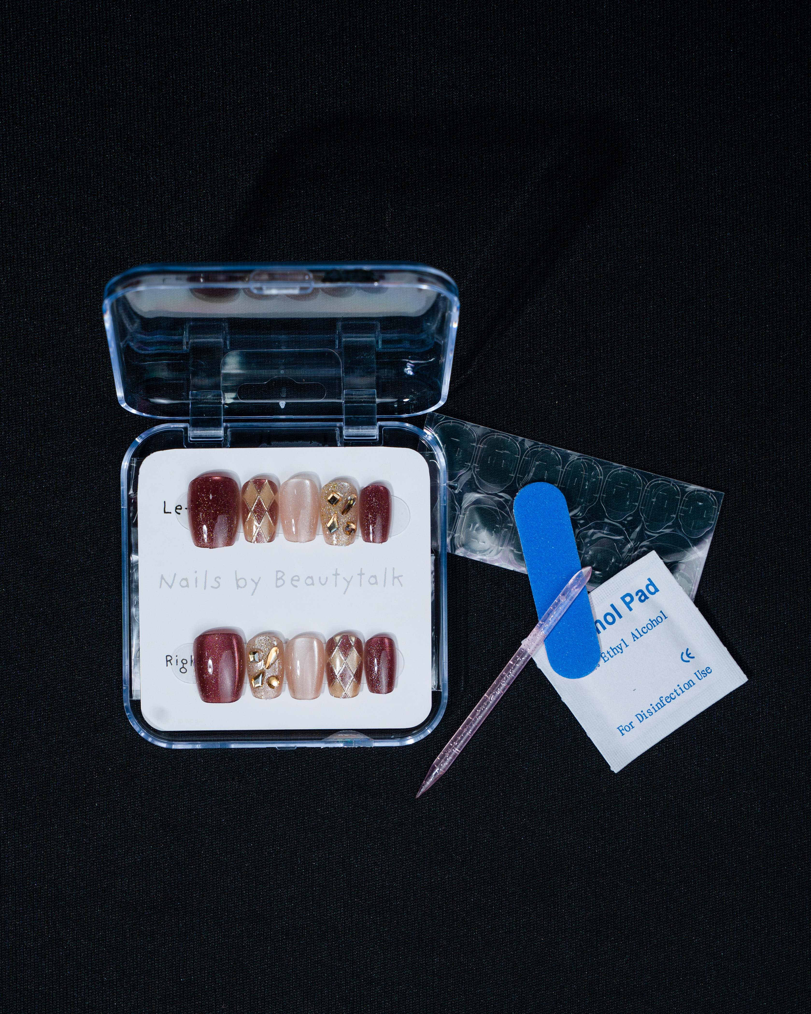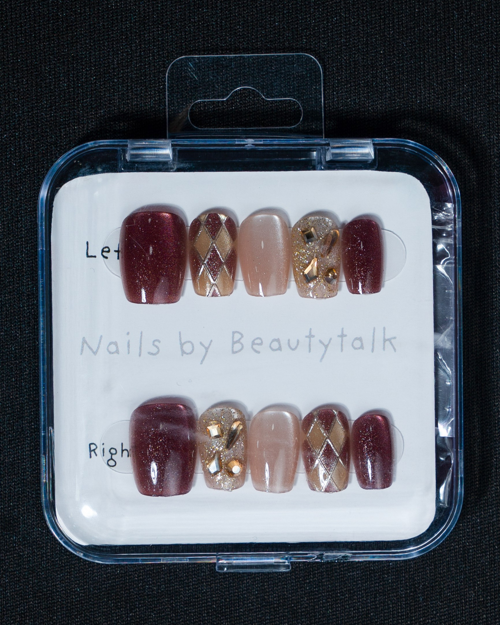 A deep red and nude press-on nail set with a glossy finish. Features glitter, gold detailing, and patterned accents.