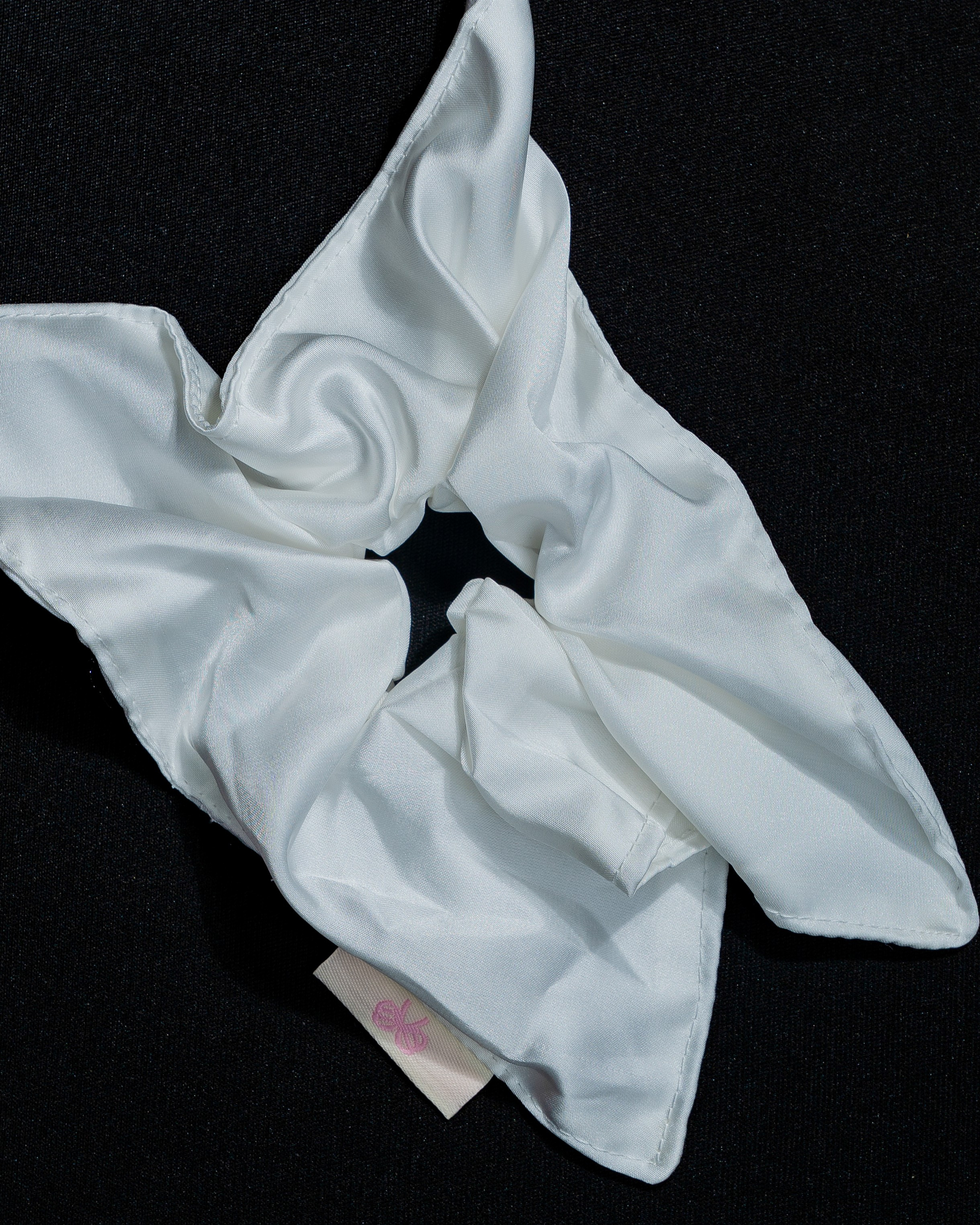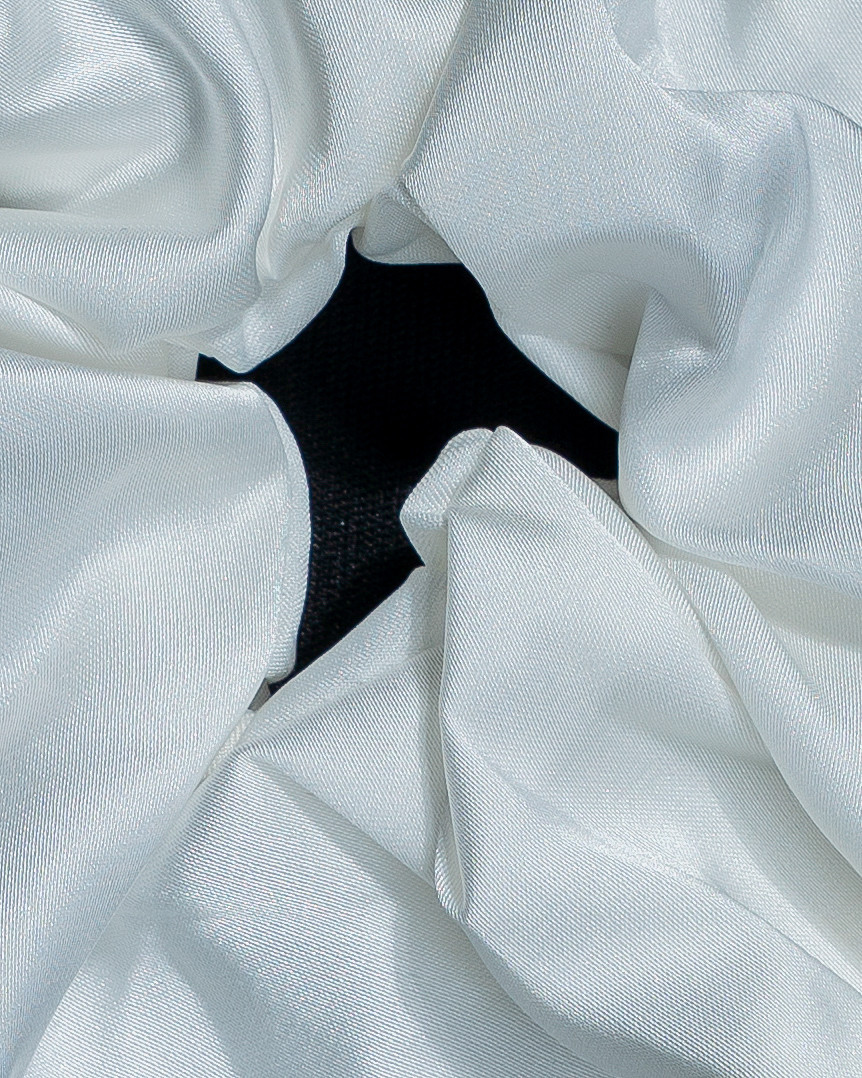 Pure, polished, and effortlessly graceful—this silky ribbon scrunchie drapes like soft snow with a luminous sheen. The flowing tails add a touch of movement and elegance, making it perfect for both minimal everyday looks and dressed-up moments.