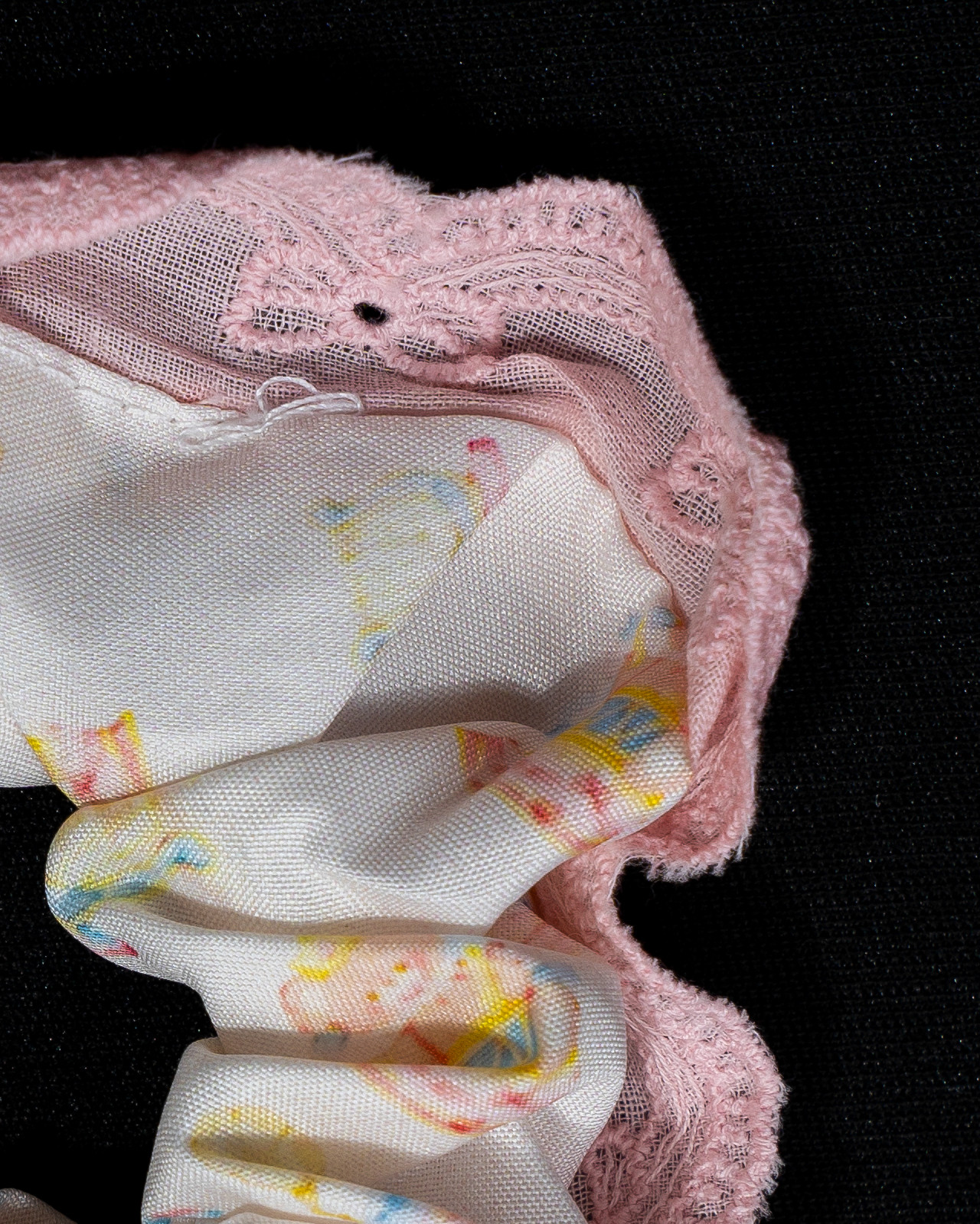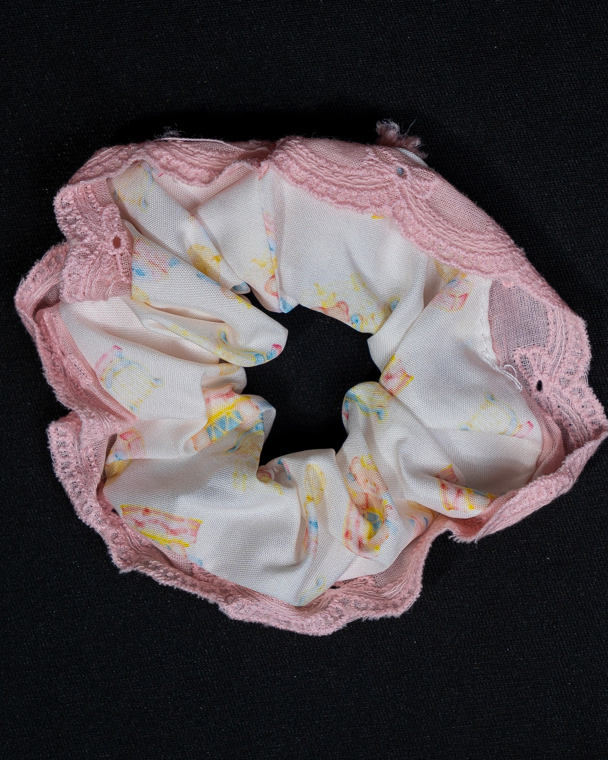 A soft and feminine scrunchie with delicate pink lace edges and a subtle sprinkle print, adding a light, playful charm to your everyday look.