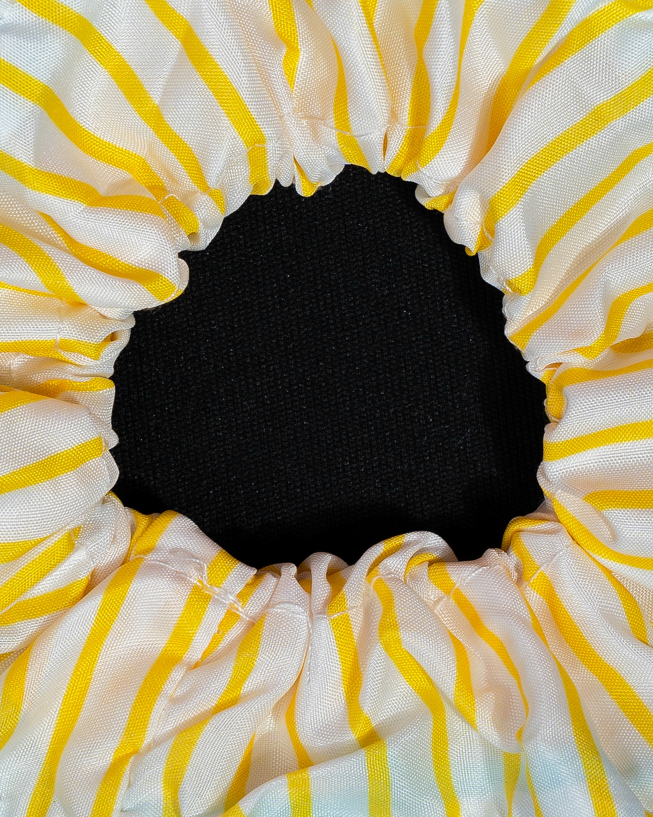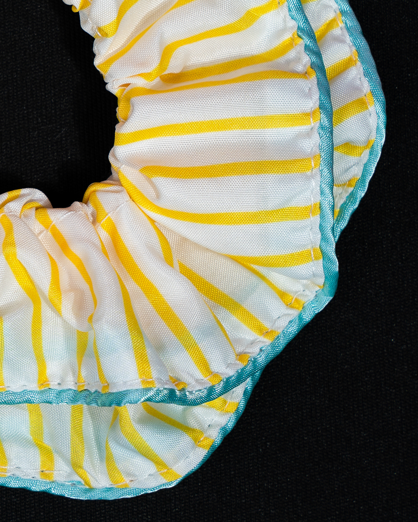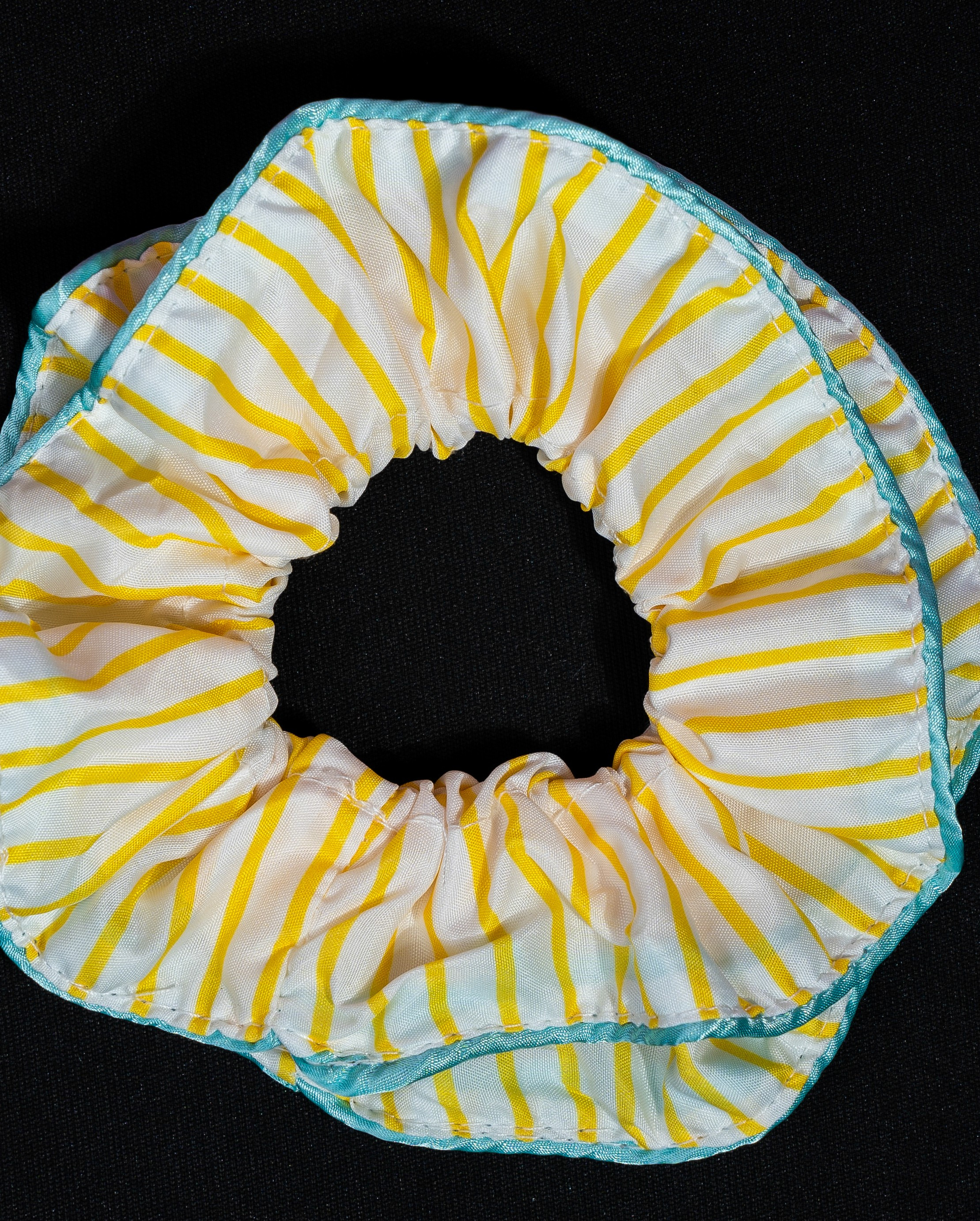 A bright and cheerful scrunchie featuring sunny yellow stripes on a soft white base, finished with a subtle blue trim for a fresh contrast. Its breezy, playful design captures a light summer vibe, perfect for adding a pop of color to everyday looks.