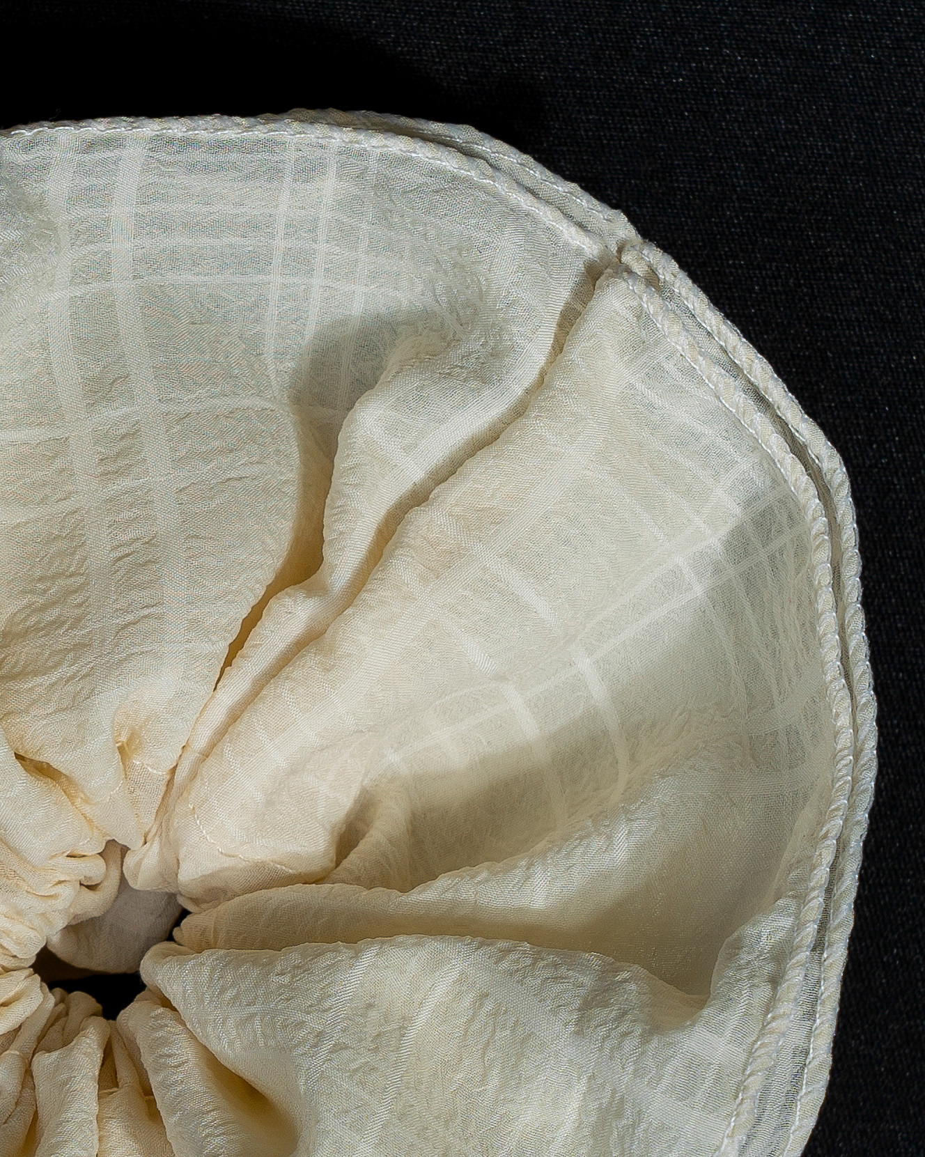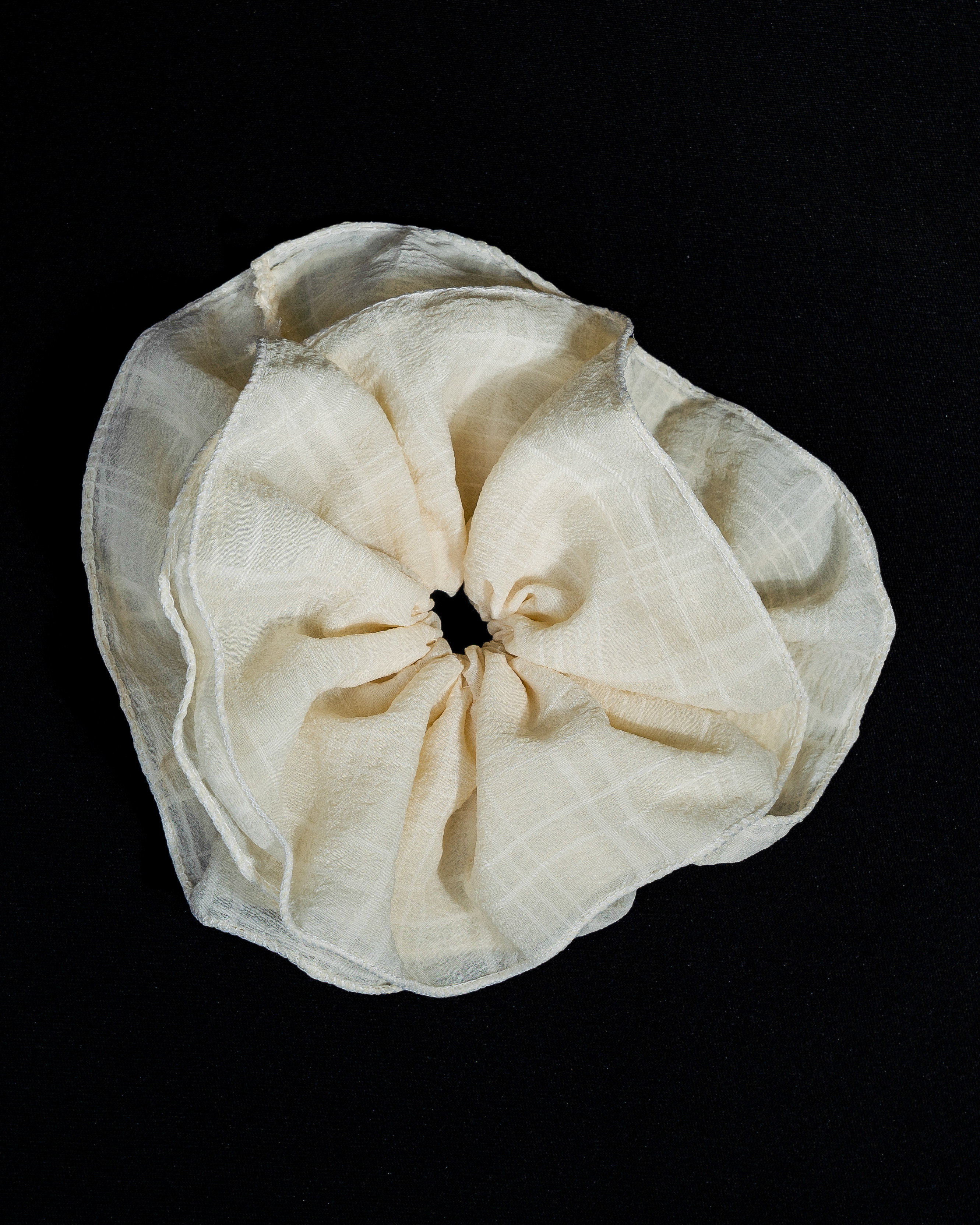 A soft vanilla-toned scrunchie with subtle checkered texture, giving it a light, airy cloud-like appearance. Its minimal yet textured design makes it effortlessly elegant—perfect for clean, everyday looks with a gentle touch of sophistication.